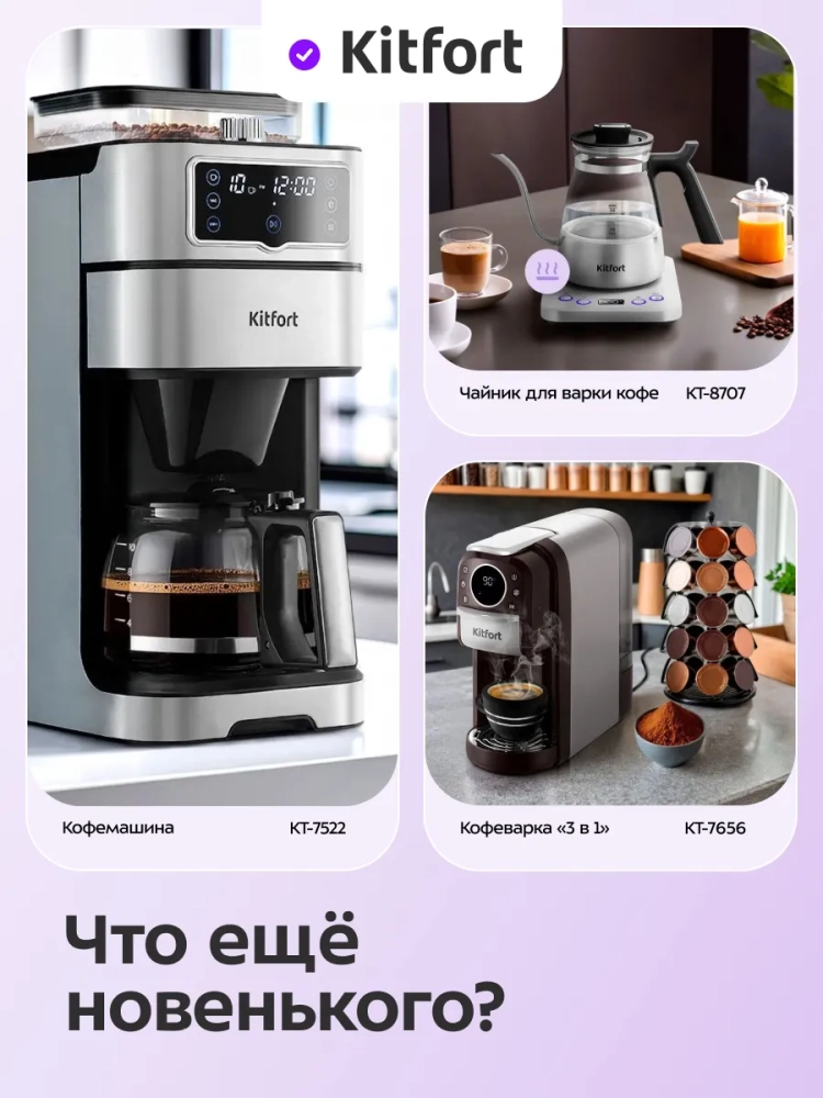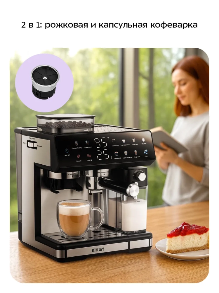 Кофейная станция «2 в 1» Kitfort КТ-7416 сочетает в себе функции рожковой и капсульной кофеварок, кофемолки и автоматического капучинатора в одном корпусе. Кофейная станция поможет приготовить эспрессо, холодный эспрессо, капучино, латте, а также множество других видов кофе на ваш вкус. Встроенная в кофейную станцию кофемолка с коническими жерновами из нержавеющей стали позволяет измельчать кофейные зерна непосредственно перед приготовлением кофе, что положительно отражается на вкусе готового напитка. А благодаря адаптеру для капсул типа Nespresso кофейная станция может использоваться как капсульная кофеварка.