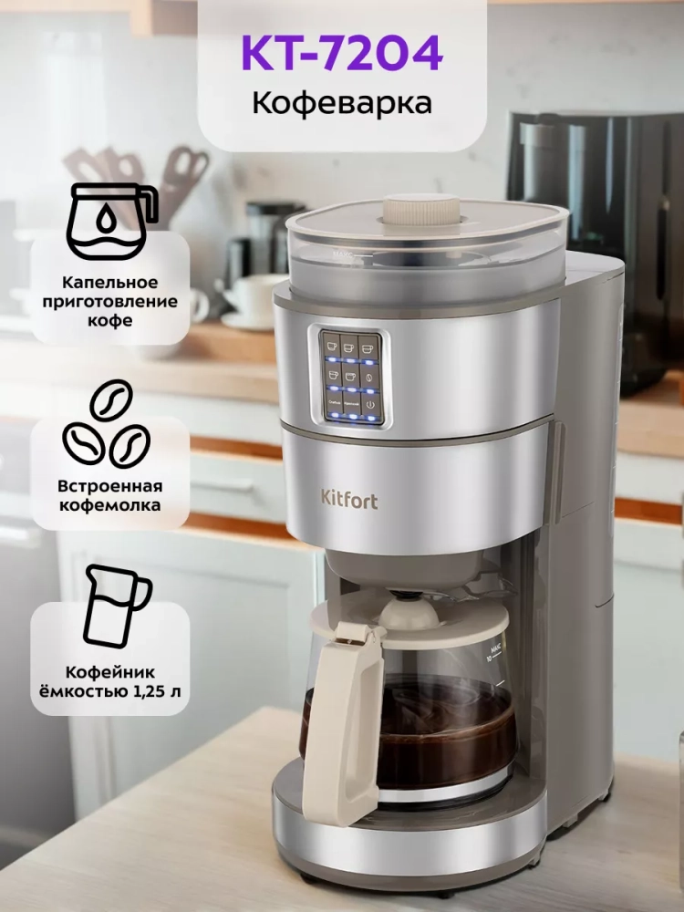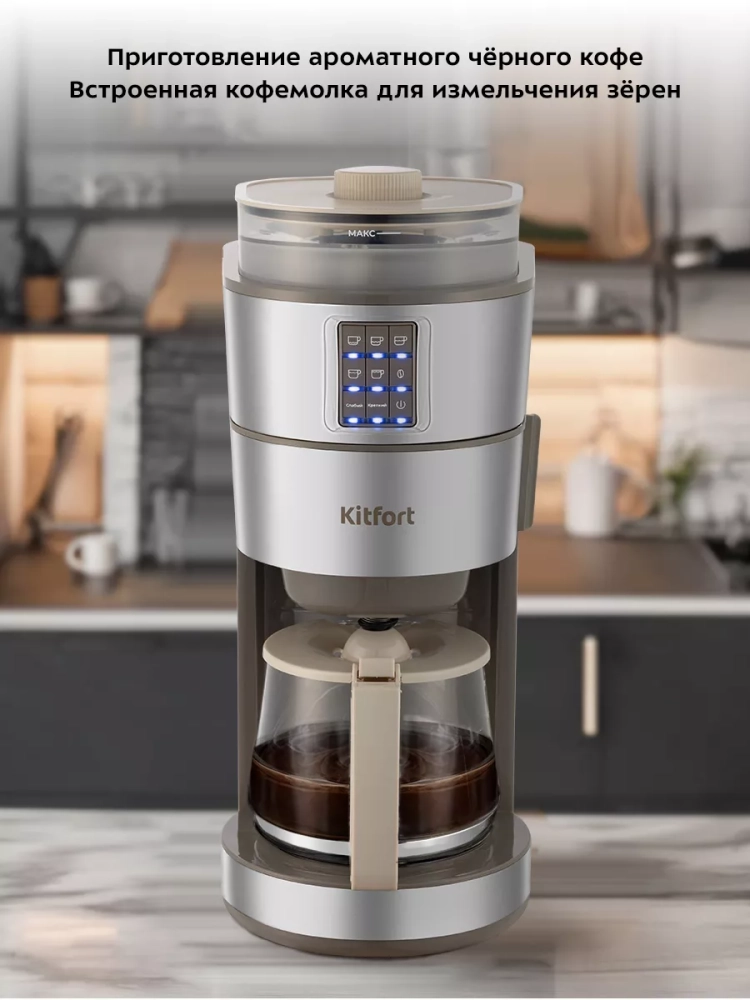 Кофемашина Kitfort КТ-7204 готовит ароматный черный кофе по принципу капельной кофеварки. Встроенная кофемолка автоматически измельчит кофейные зерна. Также в кофемашину можно засыпать уже молотый кофе.