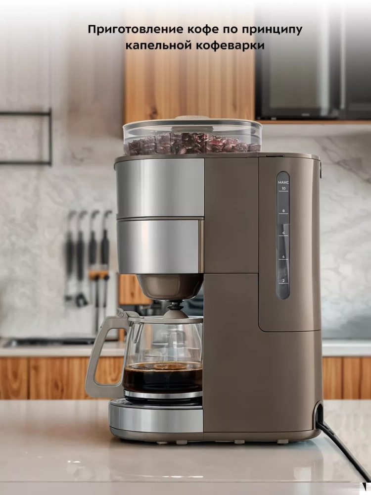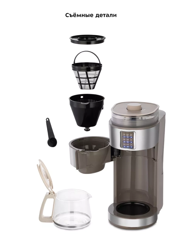 Кофемашина оборудована противокапельной системой — затвором, приостанавливающим подачу кофе при вынимании кофейника из кофемашины. Вы можете налить кофе в чашку, не дожидаясь окончания приготовления.