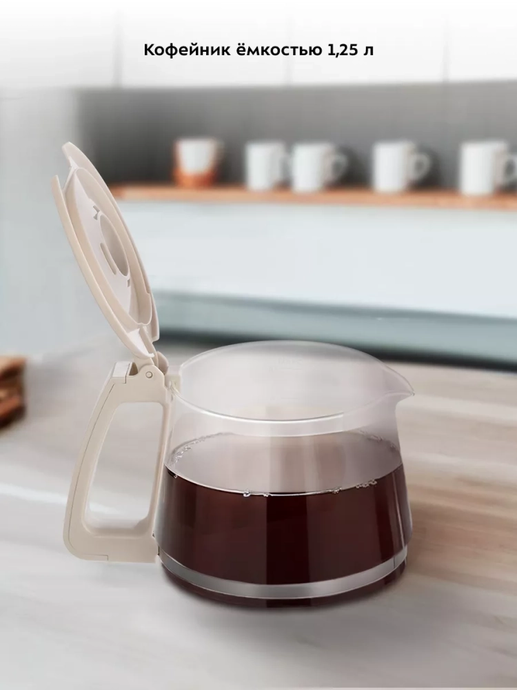 Кофейник емкостью 1,25 л вмещает кофе на 10 чашек (по 125 мл). Корпус кофейника прозрачный, поэтому вы всегда можете видеть, сколько кофе еще осталось.