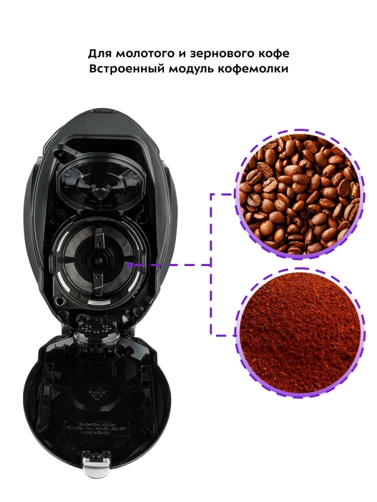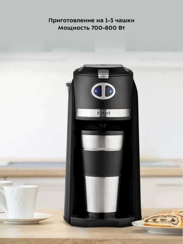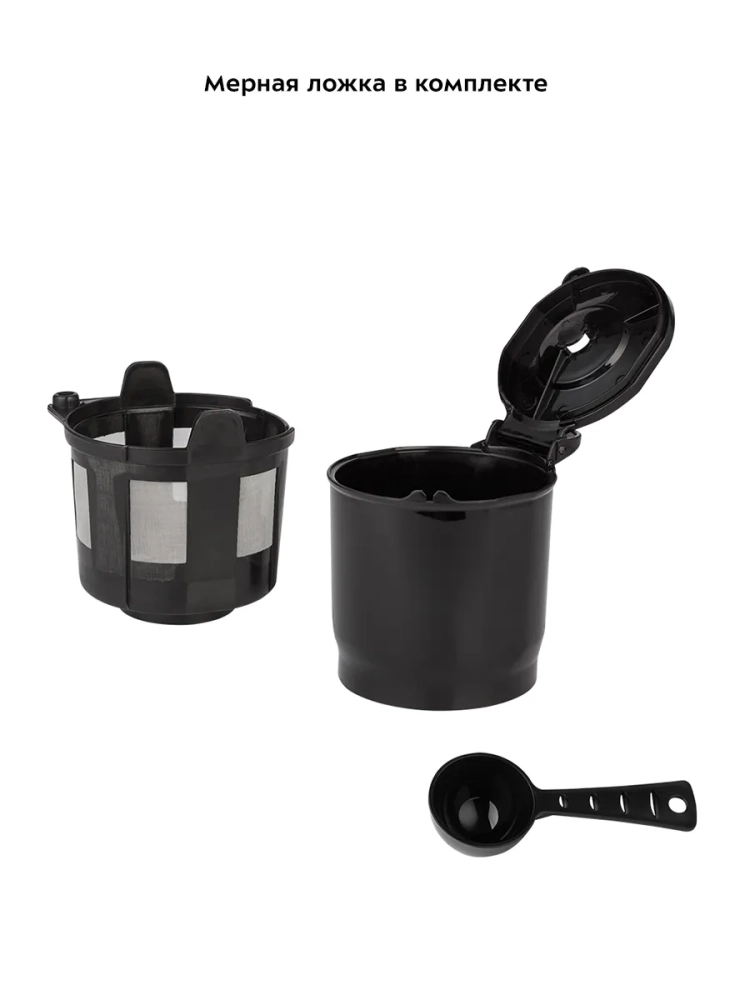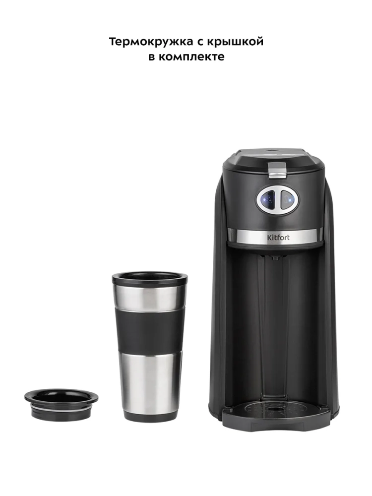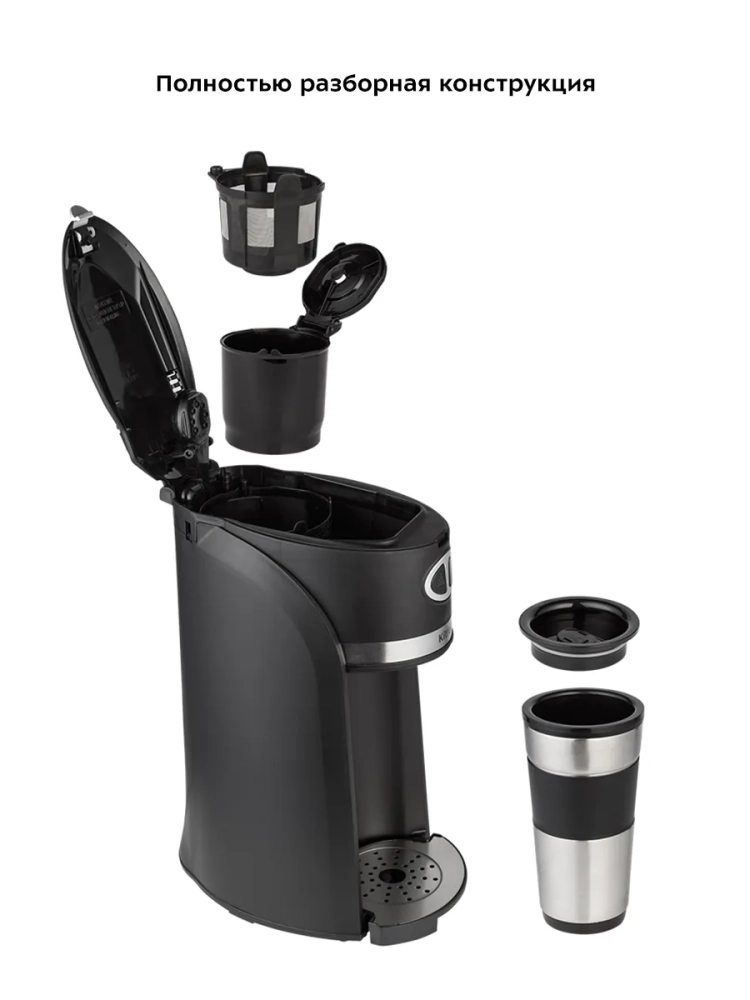 Термокружка из нержавеющей стали с силиконовой вставкой сохраняет тепло и предотвращает ожоги, а удобная крышка позволяет пить кофе на ходу. Компактные размеры кофемашины делают её идеальной для использования на кухне или в офисе, не занимая много места.