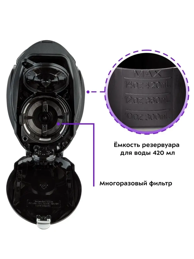 Кофемашина Kitfort КТ-797 готовит ароматный черный кофе по принципу капельной кофеварки одним нажатием кнопки. Встроенная роторная кофемолка автоматически измельчит кофейные зерна сразу в фильтре. В кофемашине вода доводится до температуры 80–90 *С, после чего медленно поступает в фильтр с молотым кофе. Пройдя через него, она попадает в термокружку, которая сохранит тепло вашего кофе. Термокружка выполнена из нержавеющей стали с силиконовой вставкой, которая не дает вам обжечься или выронить из рук термокружку. Крышка термокружки позволяет пить кофе на ходу, благодаря удобной форме отверстия для питья, которое можно закрывать, например, при ходьбе. Сетка фильтра кофемашины изготовлена из нержавеющей стали, что значительно продлевает срок службы фильтра. Кофемашина KT-797 не скользит по поверхности стола, благодаря наличию прорезиненных ножек. Компактная кофемашина KT-797 рассчитана на приготовление кофе за 1 раз на 1–3 чашки. Многоразовый фильтр вмещает 20 грамм кофейных зерен или молотого кофе. А в резервуаре для воды есть специальные отметки 300, 360 и 420 мл, которые помогают налить необходимый объем воды для приготовления кофе. Кофемашина KT-797 оборудована дисплеем, который показывает текущее время и заданные настройки. Функция отложенного старта позволит начать приготовление в заданное вами время. Вам больше не придется вставать утром на 20 минут раньше, чтобы успеть сделать себе ароматный кофе. Также кофемашина оснащена поддоном для сбора капель, который защищает поверхность стола. Кофемашина предназначена для приготовления кофе в домашних условиях или в офисе.