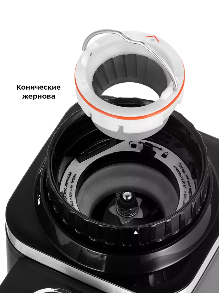 Кофемолка оснащена переключателем безопасности: она не включится, если контейнер для зерен не установлен или установлен неправильно.
