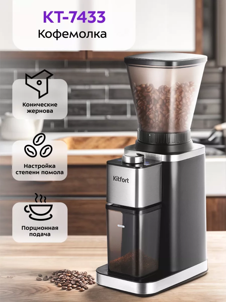 Жерновая кофемолка Kitfort КТ-7433 предназначена для помола кофейных зерен. Устройство оснащено коническими жерновами из нержавеющей стали.