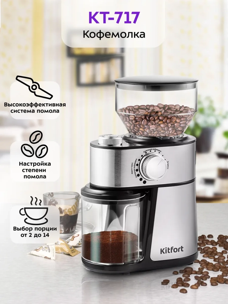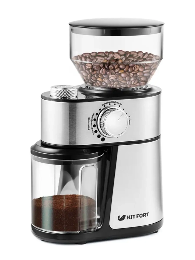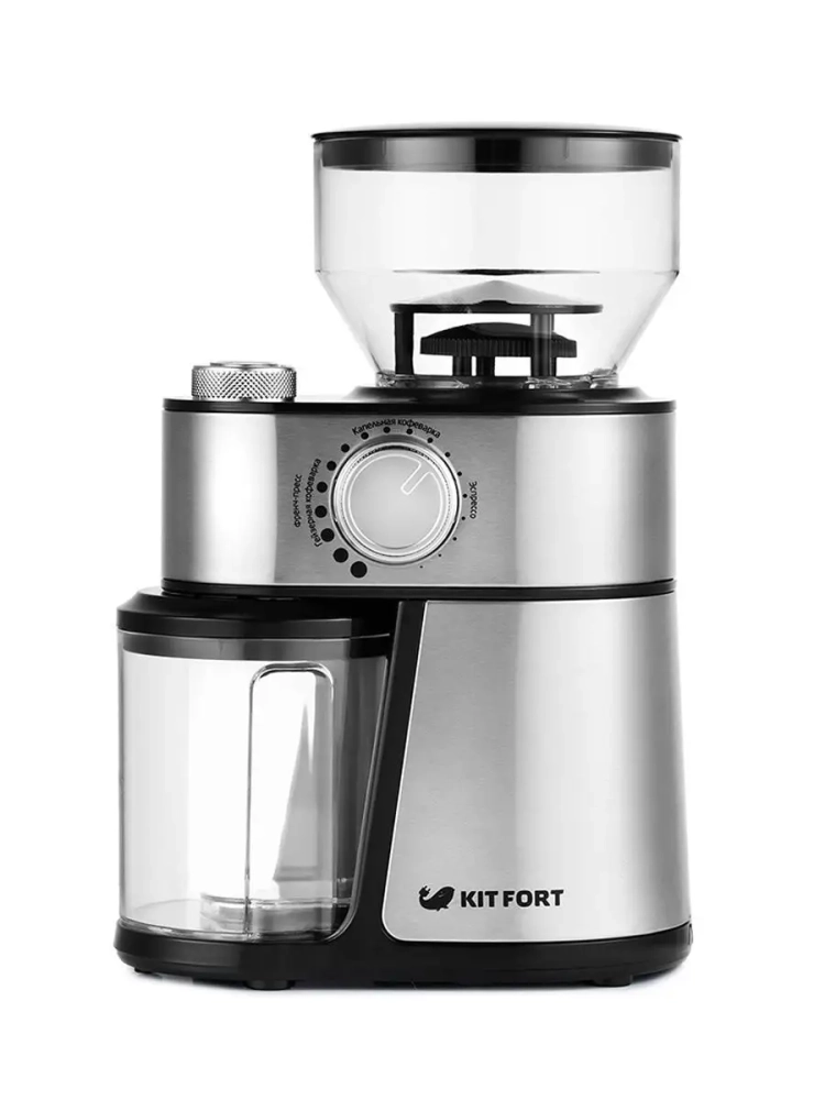 Жерновая кофемолка Kitfort КТ-717 предназначена для помола кофейных зерен. Она оснащена плоскими металлическими жерновами из углеродистой стали.