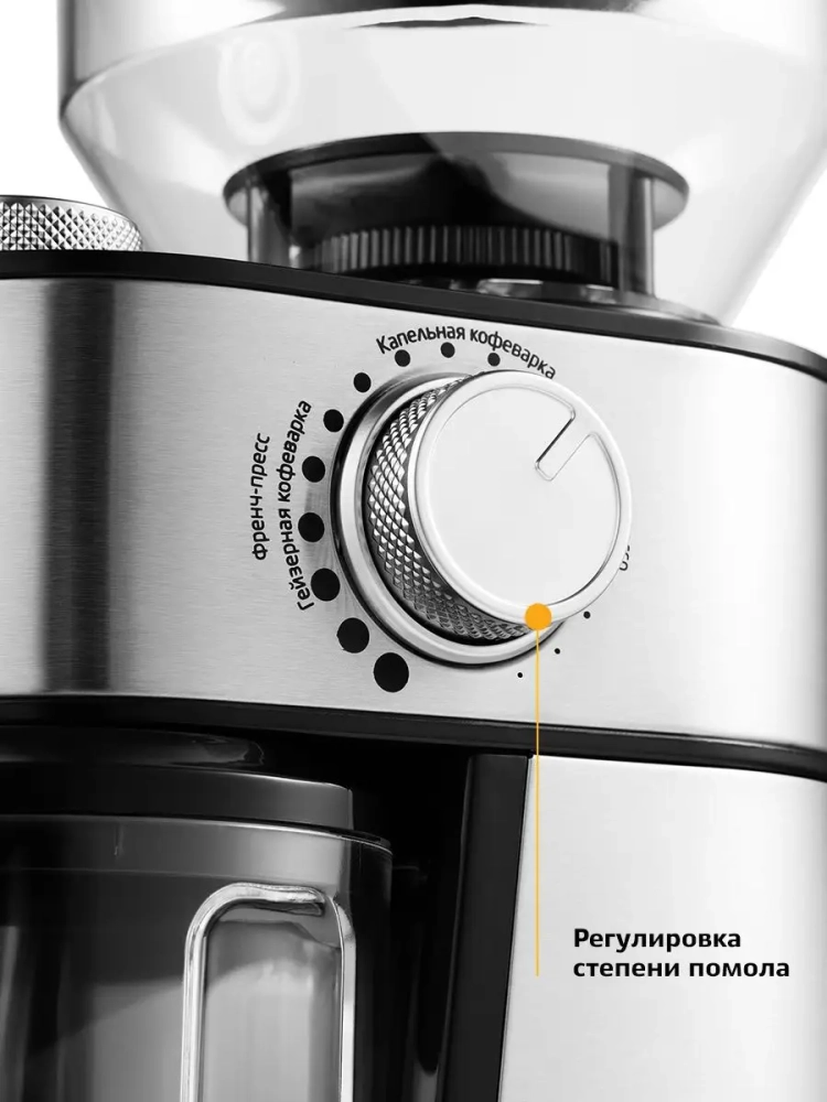 Жерновая кофемолка дает равномерный помол и позволяет настроить его степень: от мелкого для эспрессо кофеварки до крупного для френч-пресса. Равномерный помол важен для эспрессо кофеварок, при неравномерном помоле вкус заваренного кофе портится. При помоле кофе не перегревается, как это иногда случается в роторных кофемолках. Вы можете выбрать, какое количество зерен требуется намолоть за один раз. Кофемолка намелет нужное количество кофе и автоматически отключится.