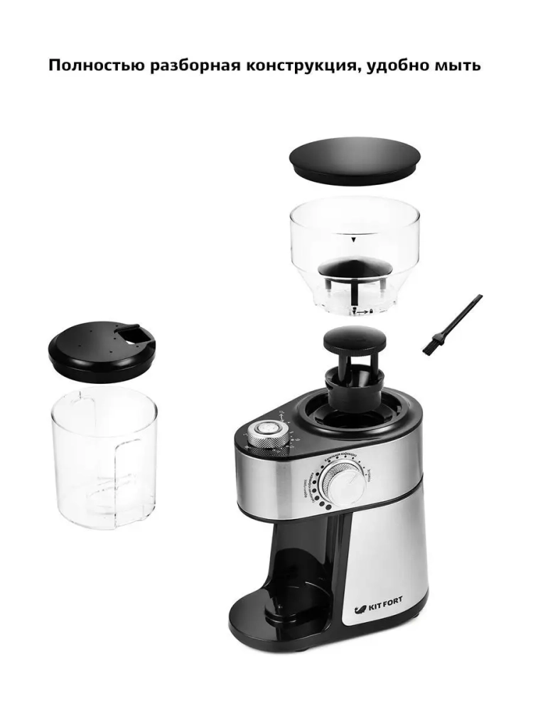 Контейнеры для молотого кофе и для зерен съемные. Верхний жернов также съемный для удобства очистки. Для чистки жерновов в комплекте идет маленькая щеточка.