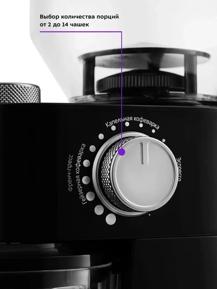 Жерновая кофемолка дает равномерный помол и позволяет настроить его степень: от мелкого для эспрессо кофеварки до крупного для френч-пресса. Равномерный помол важен для эспрессо кофеварок, при неравномерном помоле вкус заваренного кофе портится. При помоле кофе не перегревается, как это иногда случается в роторных кофемолках. Вы можете выбрать, какое количество зерен требуется намолоть за один раз. Кофемолка намелет нужное количество кофе и автоматически отключится.