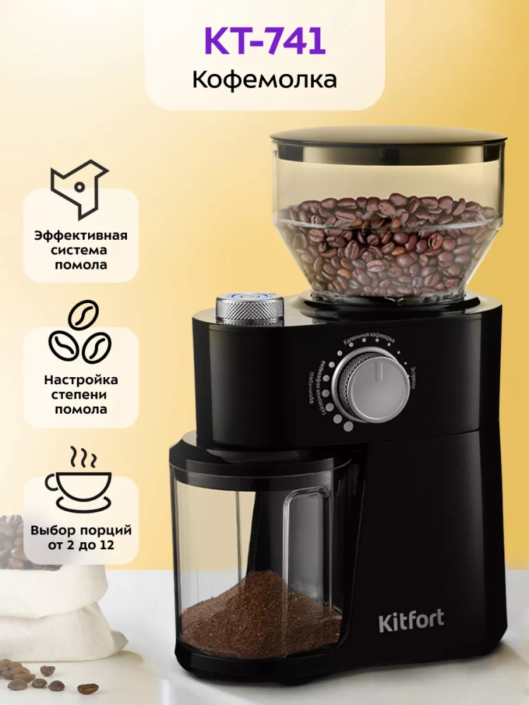Жерновая кофемолка Kitfort КТ-741 предназначена для помола кофейных зерен. Она оснащена плоскими металлическими жерновами из углеродистой стали.