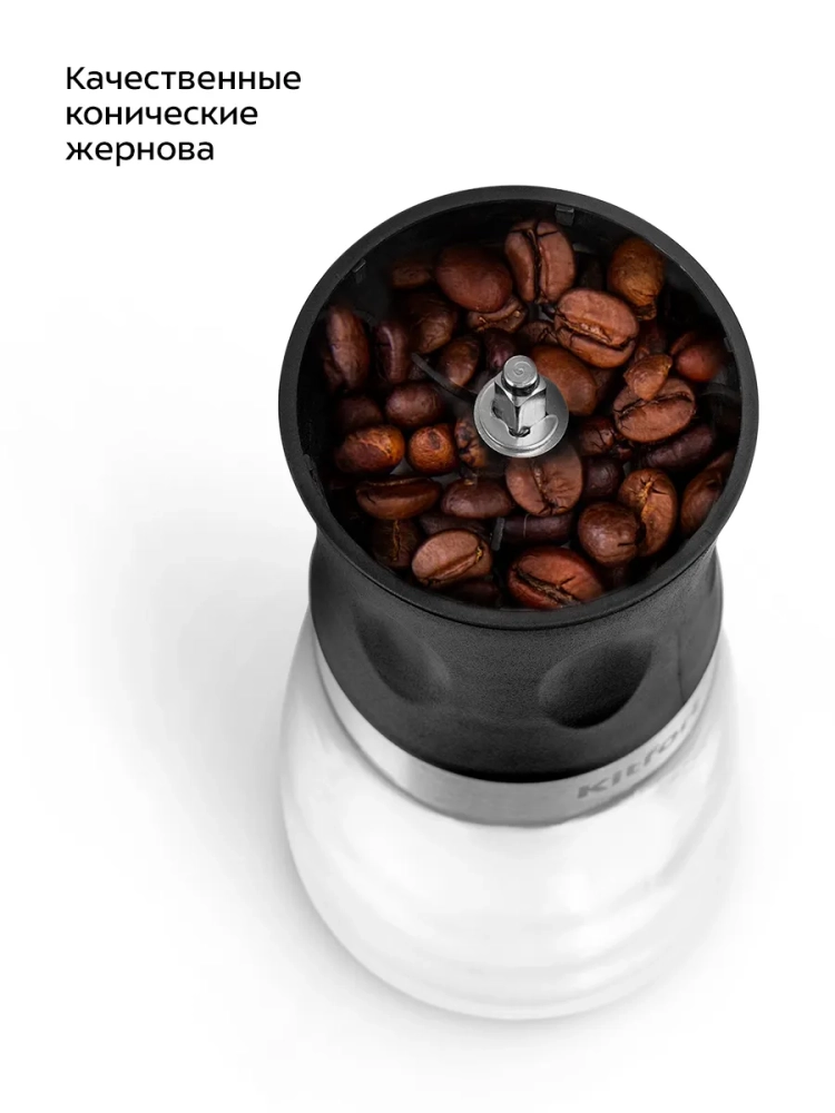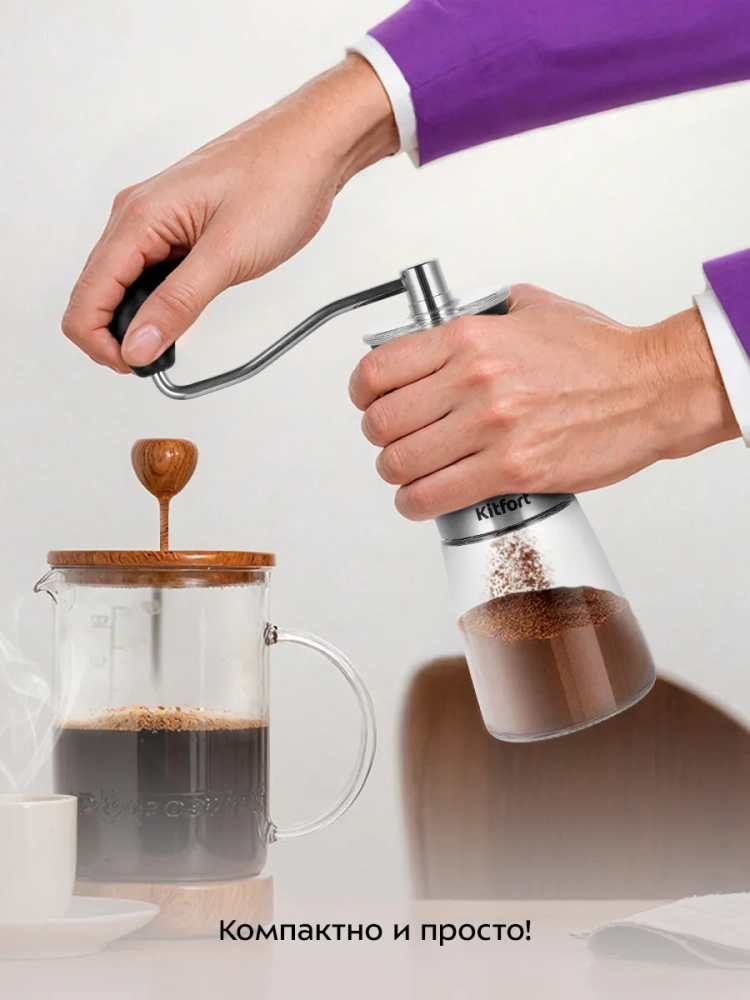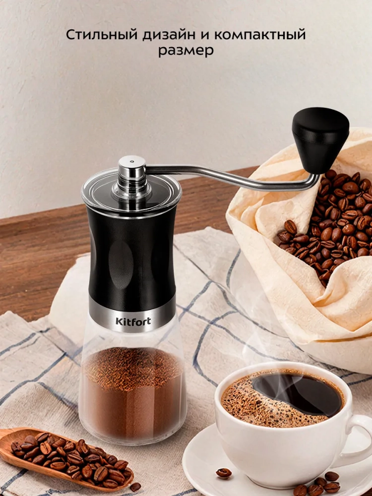 Кофемолка Kitfort КТ-7469 является ручной жерновой кофемолкой и предназначена для помола кофейных зерен. Она оснащена коническими жерновами из нержавеющей стали.