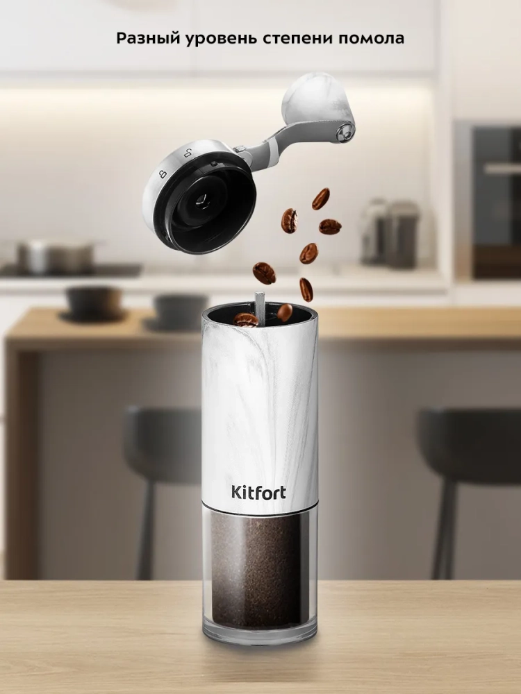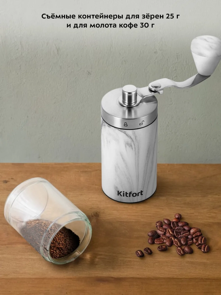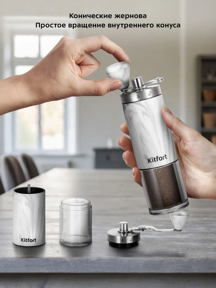 Кофемолка Kitfort КТ-7471 является ручной жерновой кофемолкой и предназначена для помола кофейных зерен. Она оснащена коническими жерновами из керамики.
