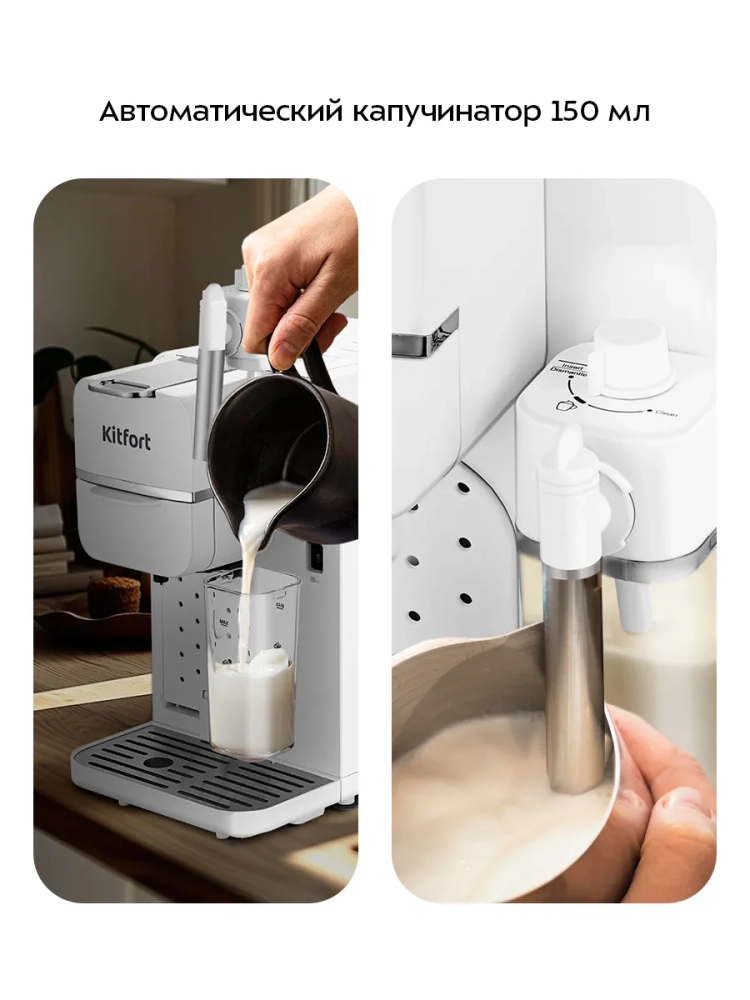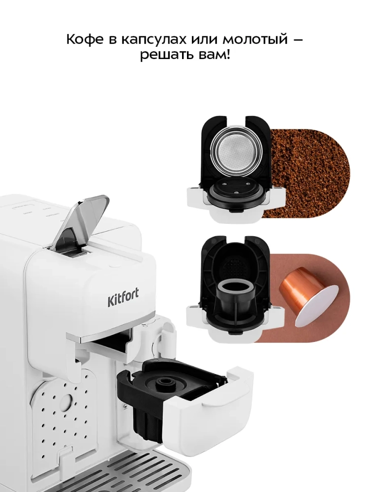 Кофеварка «2 в 1» Kitfort КТ-7253 — многофункциональное бытовое устройство, сочетающее в себе функции капсульной и рожковой кофеварки. Благодаря адаптерам кофеварка подходит для капсул типа Nespresso, а также для молотого кофе. Капсульно-рожковая кофеварка поможет приготовить кофе эспрессо, капучино или латте, а также множество других видов кофе на ваш вкус. Ключевым отличием кофеварки «2 в 1» от всех остальных кофеварок, турок и прочих кофейных устройств является возможность приготовления кофе из капсул и приготовление кофе аналогично приготовлению кофе в рожковой кофеварке. Молотый кофе помещается в фильтр адаптера и прессуется в таблетку. Для приготовления многих кофейных напитков на основе эспрессо используют молочную пену. Благодаря автоматическому капучинатору, встроенному в кофеварку, вы можете сделать молочную пенку для капучино или латте. Автоматический капучинатор в кофеварке представляет собой резервуар для молока с крышкой, трубку забора молока и трубку подачи молочной пены. Трубка забора молока находится в резервуаре для молока и погружена в холодное молоко. При включении приготовления капучино или латте, кофеварка приготовит эспрессо и автоматически взобьет молочную пену и подаст ее прямо в чашку. Кофеварка оснащена съемным резервуаром для воды и двумя адаптерами. Для адаптера для молотого кофе предусмотрено 2 фильтра: для одной порции эспрессо и для двойного эспрессо. Мерная ложка-темпер поможет наполнить фильтр адаптера и утрамбовать в нем кофейную таблетку. Ценители кофе выбирают рожковые кофеварки для дома, потому что им важно непосредственно участвовать в процессе приготовления кофе, создавать свои собственные рецепты, узнавать тонкости и хитрости настоящего кофейного напитка. Капсульные кофеварки позволяют сделать процесс приготовления кофе быстрым, простым и удобным, кофе в капсулах уже спрессован. Кофеварка «2 в 1» KT-7253 совмещает в себе все преимущества каждого вида кофеварок.