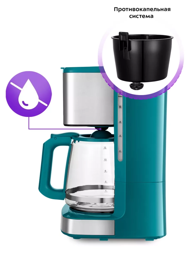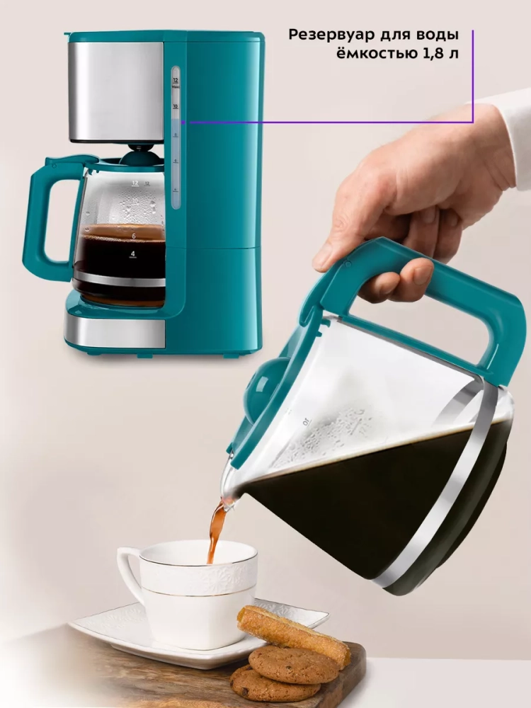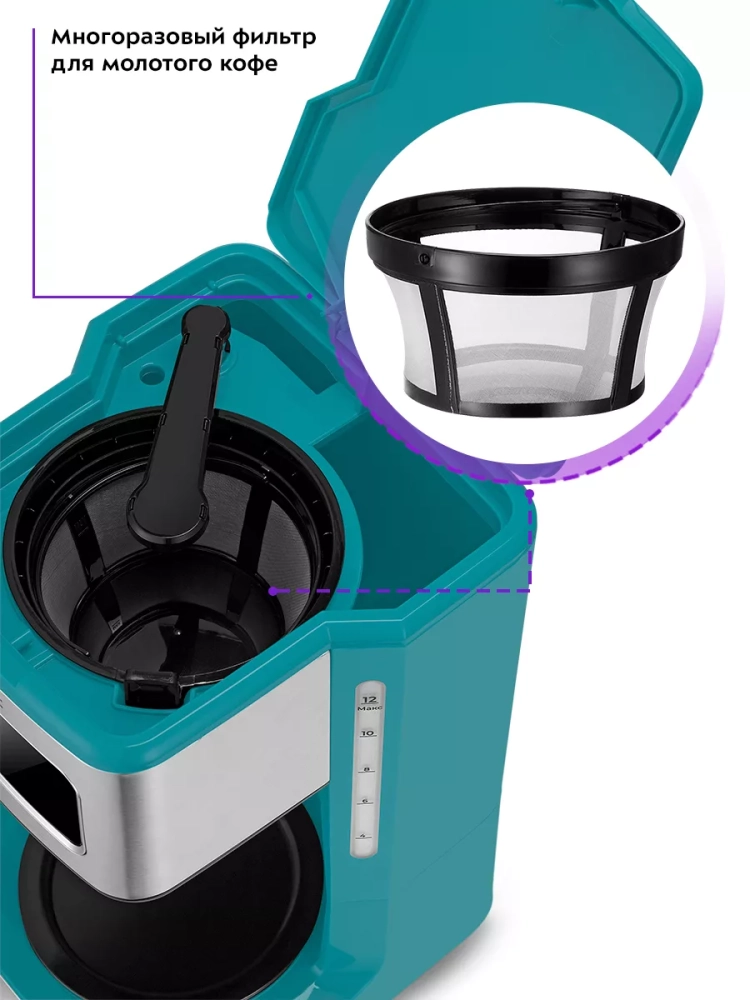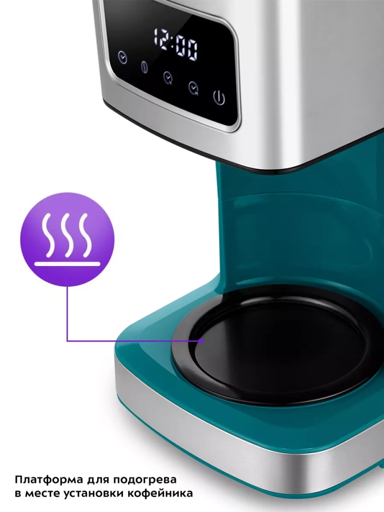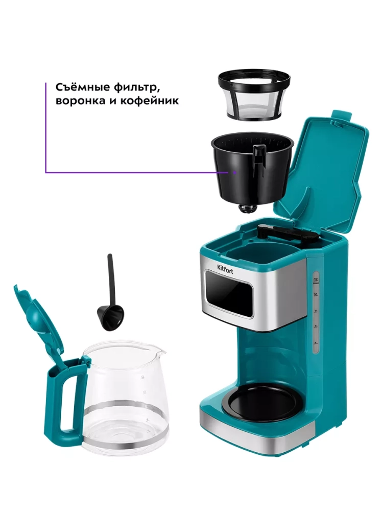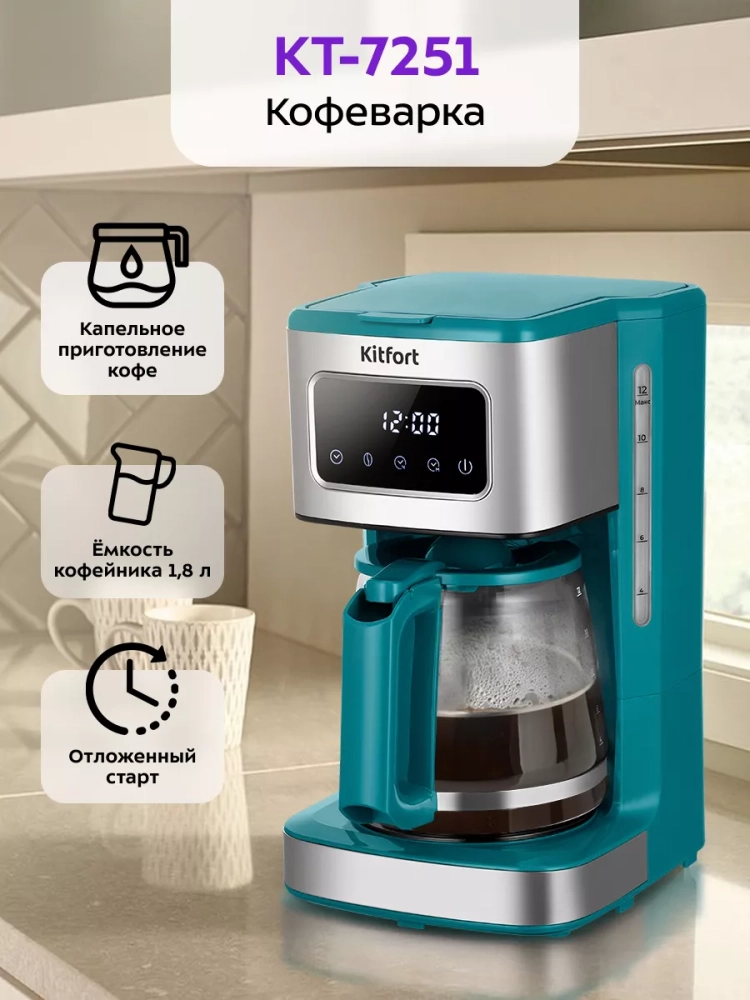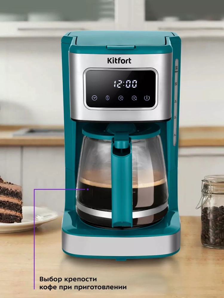 Электрическая капельная кофеварка Kitfort КТ-7251 — это идеальный кофейный аппарат для приготовления ароматного черного кофе из молотого кофе. Эта бытовая техника позволяет выбрать крепость напитка, будь то не крепкий или более насыщенный вариант. В процессе варки вода в приборе нагревается и подается в фильтр с молотым кофе, обеспечивая равномерное заваривание. Многоразовый фильтр можно использовать неограниченное количество раз, что делает процесс приготовления удобным и экономичным. Кофе после прохождения через фильтр поступает в стеклянный кофейник, который установлен на платформу для подогрева. Это гарантирует сохранение температуры напитка даже после завершения процесса варки. Подогрев электрокофеварки включается автоматически по окончании приготовления, позволяя наслаждаться горячим кофе в любое время. Особенностью данной модели является противокапельная система воронки — затвор приостанавливает подачу жидкости при вынимании кофейника из аппарата. Это значит, что вы можете налить себе чашку свежезаваренного кофе без ожидания полного завершения цикла. Резервуар для воды объемом 1,8 литра позволяет приготовить до 12 чашек (по 150 мл) за один раз. На резервуаре и кофейнике нанесены отметки уровня воды и готового напитка для удобства использования. Управление электроприбором осуществляется с помощью кнопок на панели управления с дисплеем, где отображаются выбранный режим работы и текущее время или время подогрева. Функция отложенного старта дает возможность задать время начала варки заранее: установите нужное время вечером — утром вас будет ждать свежий ароматный кофе от Китфорт.