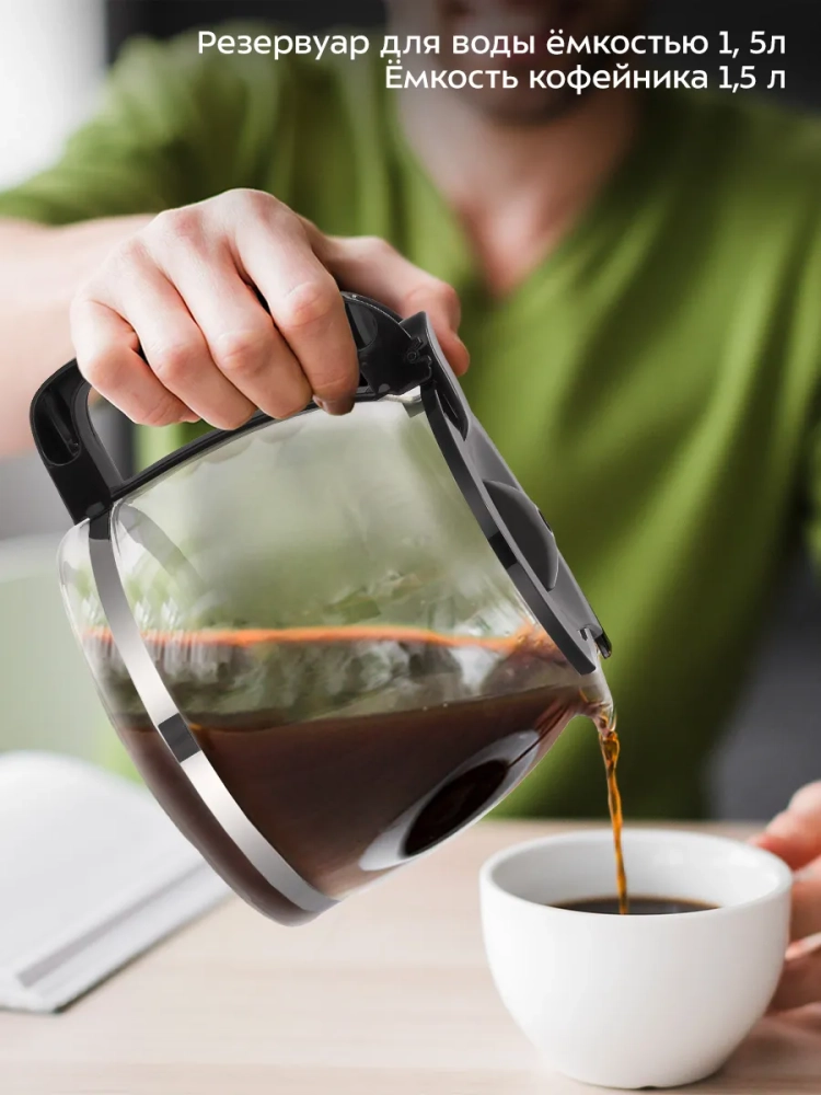 Резервуар для воды емкостью 1,5 л позволяет за один раз приготовить кофе на 12 чашек (по 125 мл). На резервуаре для воды расположена мерная шкала, на которую нанесены соответствующие отметки, поэтому вам будет удобно приготовить нужное количество чашек кофе. Кофейник стеклянный, поэтому вы всегда можете видеть, сколько кофе осталось.