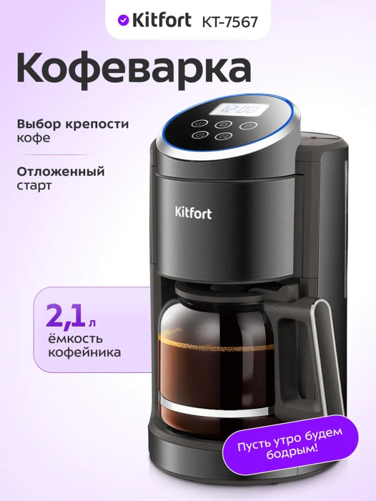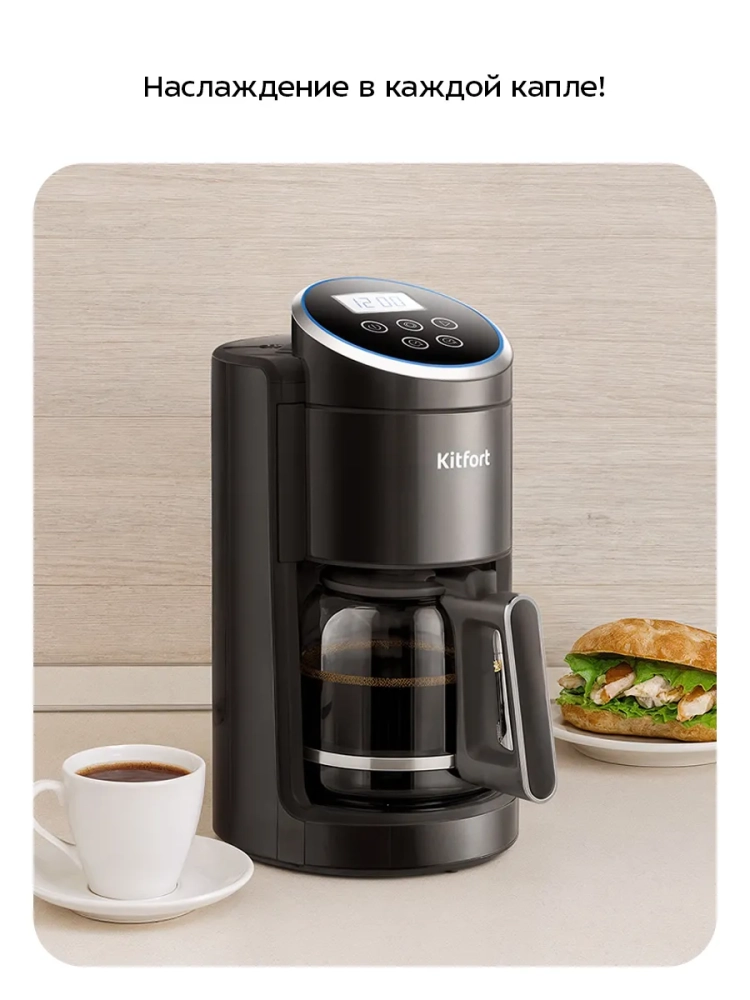 Капельная кофеварка Kitfort КТ-7567 готовит ароматный черный кофе из молотого кофе.