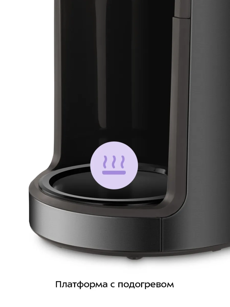 При приготовлении кофе вода нагревается, а затем подается в фильтр с молотым кофе. Многоразовым фильтром можно пользоваться неограниченное количество раз. Пройдя через фильтр, кофе поступает в стеклянный кофейник. В месте установки кофейника находится платформа для подогрева. По завершении приготовления кофе включается платформа для подогрева на 2 часа. Вы можете настроить время работы платформы для подогрева от 0 часов 0 минут до 4 часов 0 минут с шагом 1 минута перед началом приготовления.