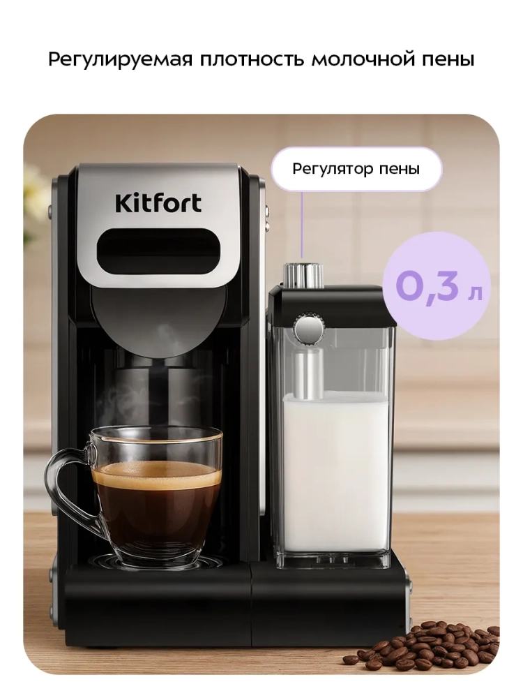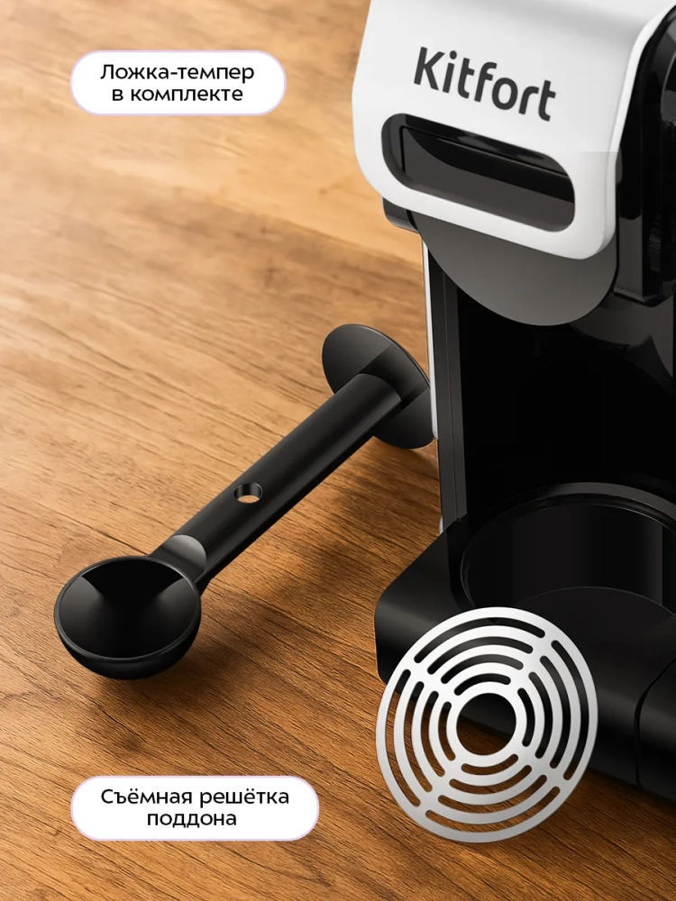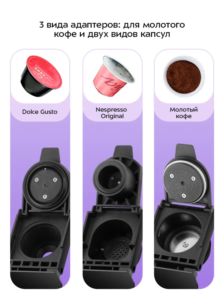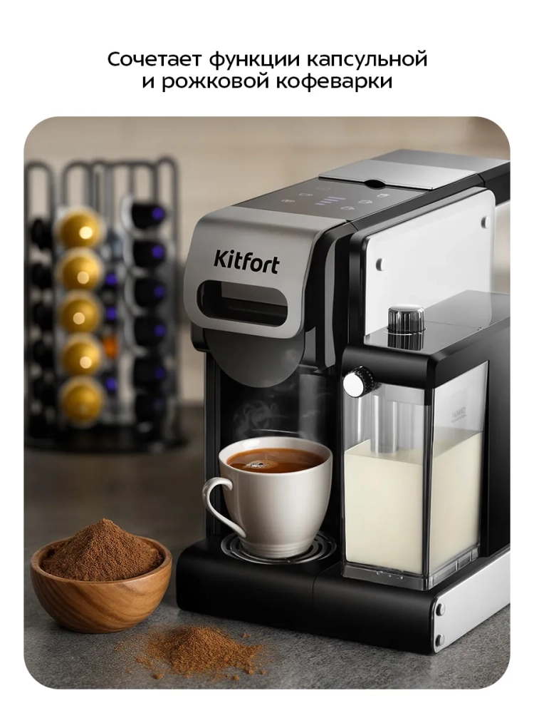 Кофеварка «3 в 1» Kitfort КТ-7675 — многофункциональное устройство, сочетающее в себе функции капсульной и рожковой кофеварки. Благодаря адаптерам кофеварка подходит для капсул типа Nespresso Original и Dolce Gusto, а также для молотого кофе.