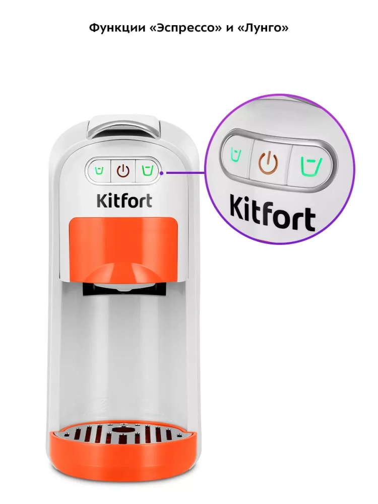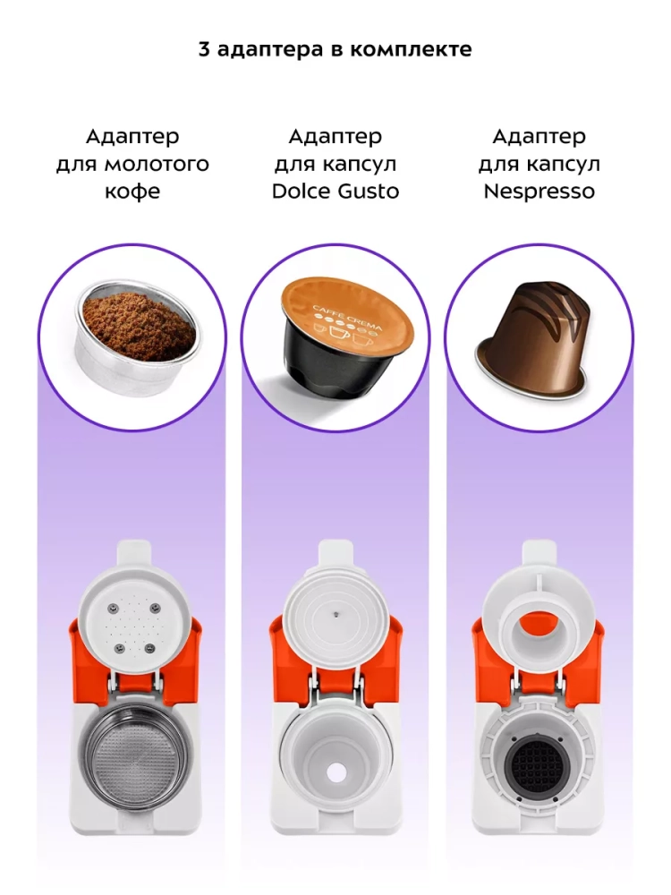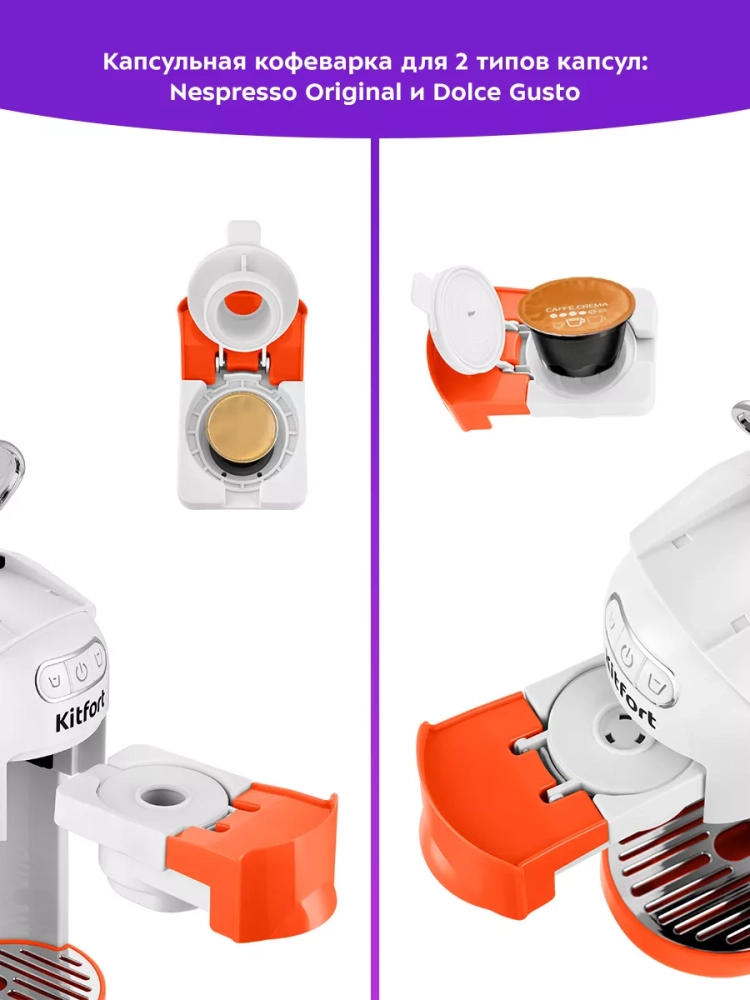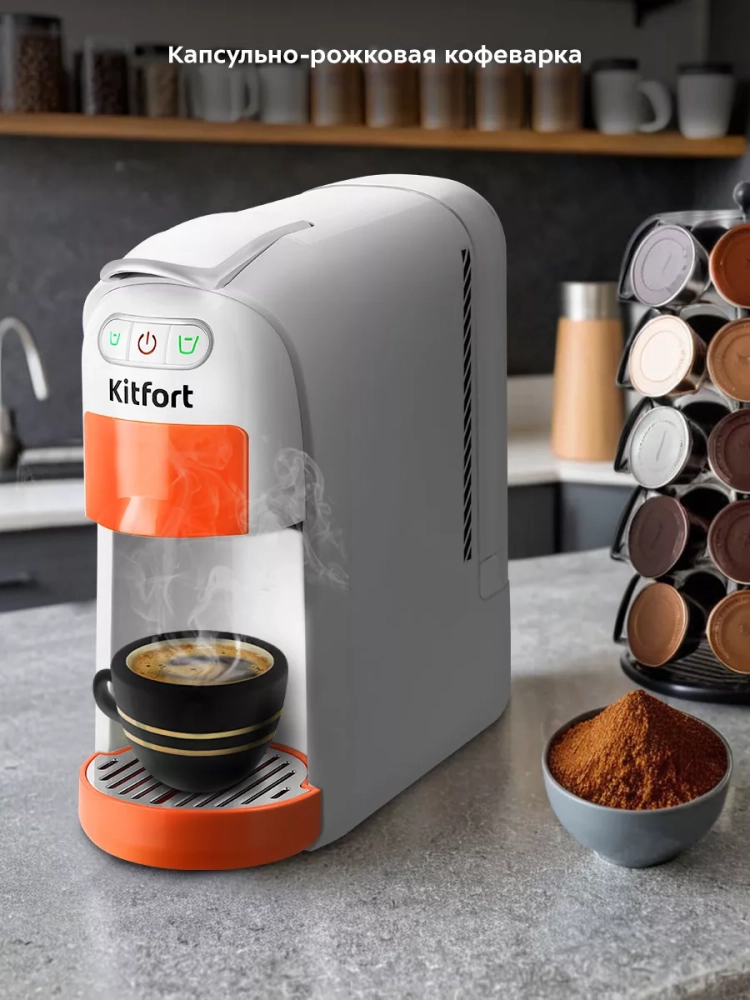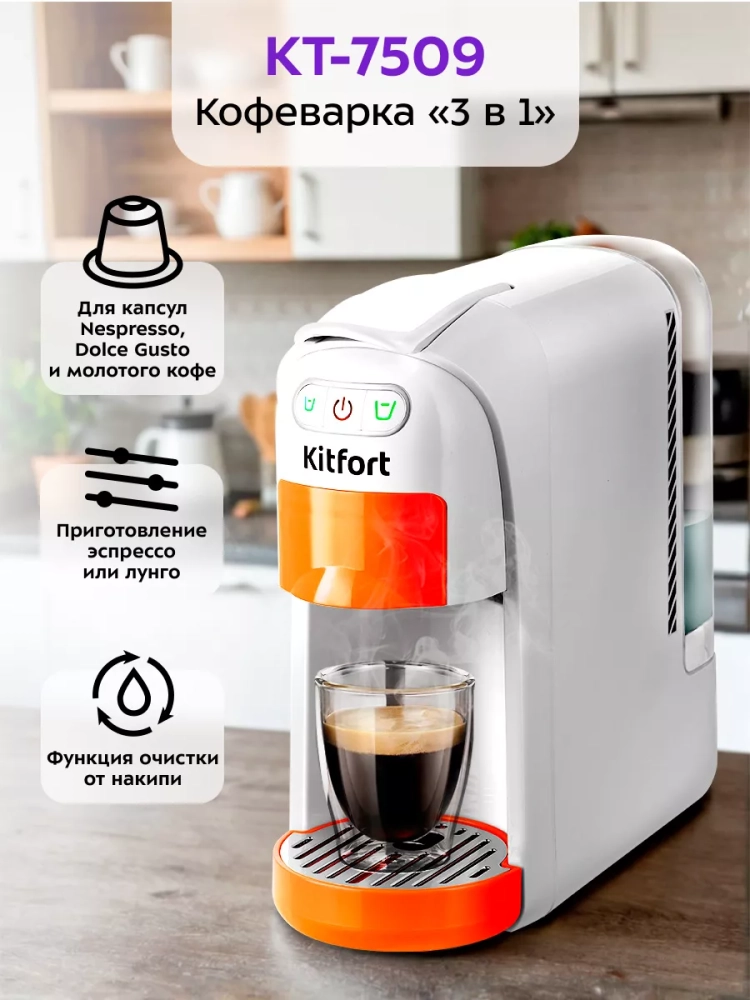 Кофеварка Kitfort «3 в 1» КТ-7509 — многофункциональное устройство, сочетающее в себе функции капсульной и рожковой кофеварки. Благодаря адаптерам кофеварка подходит для капсул типа Nespresso Original и Dolce Gusto, а также для молотого кофе.