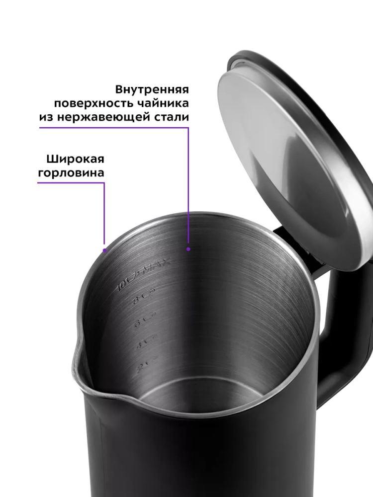 Вы также можете просто вскипятить воду в чайнике, не включая приготовление кофе. Емкость чайника составляет 1,25 л до максимальной отметки. У чайника двойные стенки, внутренняя поверхность выполнена из нержавеющей стали, а корпус снаружи — из пластмассы. Благодаря этому вода в чайнике дольше остывает и не соприкасается с пластмассовыми частями при нагреве или кипячении. Также это может уберечь от ожога. Ручка чайника пластмассовая, не нагревается и удобно лежит в руке.