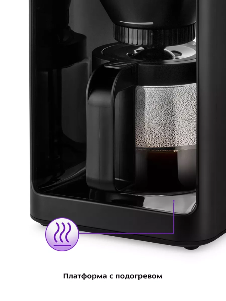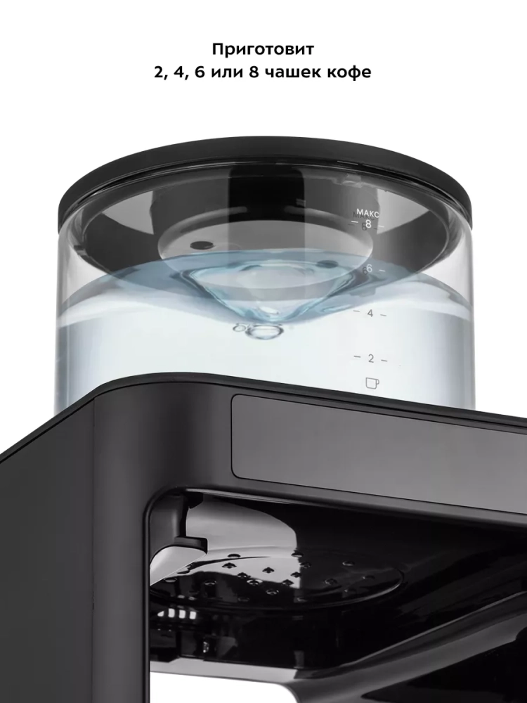 Капельная кофеварка рассчитана на приготовление 2, 4, 6 или 8 чашек кофе. Многоразовый фильтр вмещает до 70 грамм молотого кофе, но рекомендуемое количество молотого кофе на 8 чашек кофе — 48 грамм. На резервуаре для воды и кофейнике нанесены соответствующие отметки, поэтому вам будет удобно отмерить количество воды, необходимое для приготовления желаемого количества кофе.