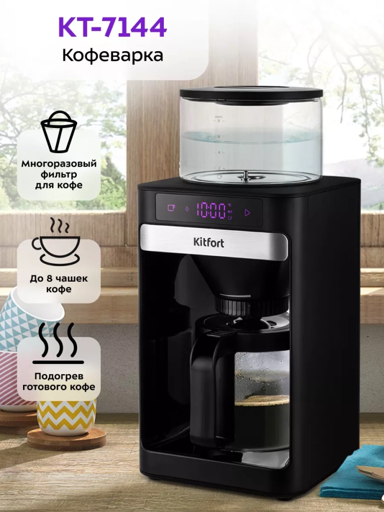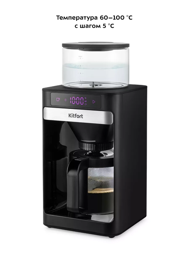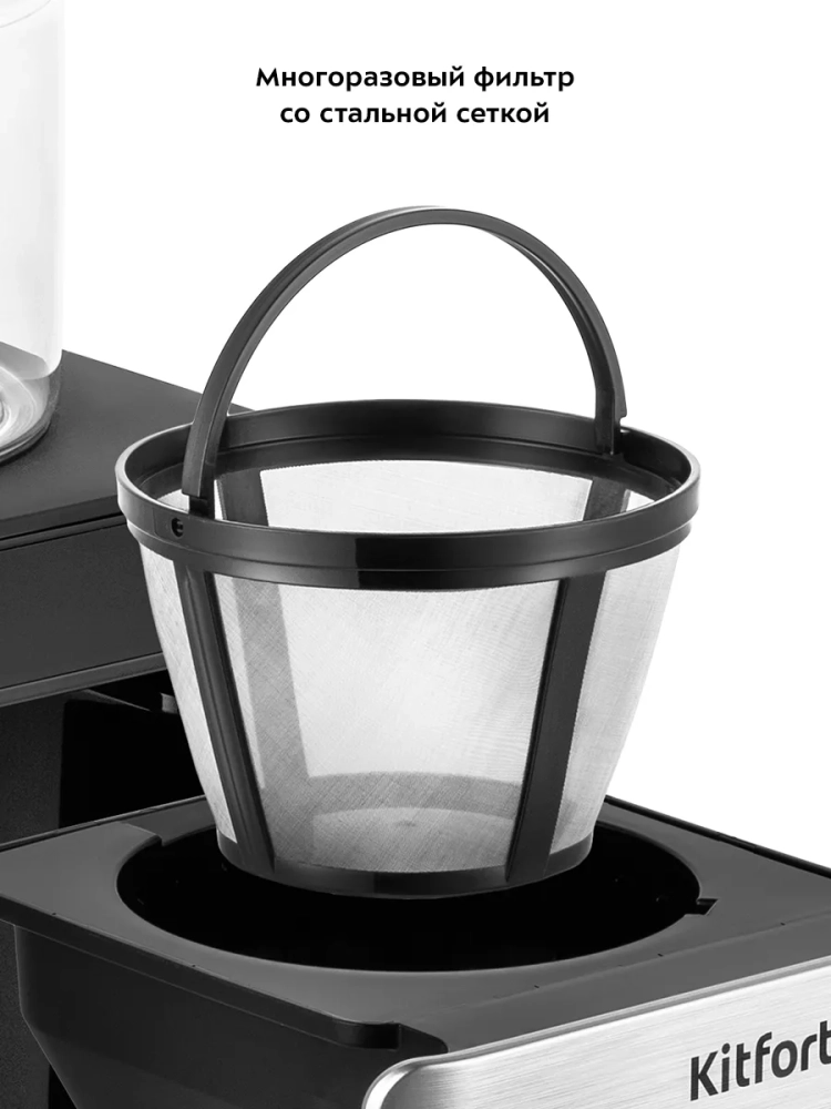 Капельная кофеварка Kitfort КТ-7144 готовит ароматный черный кофе из молотого кофе.