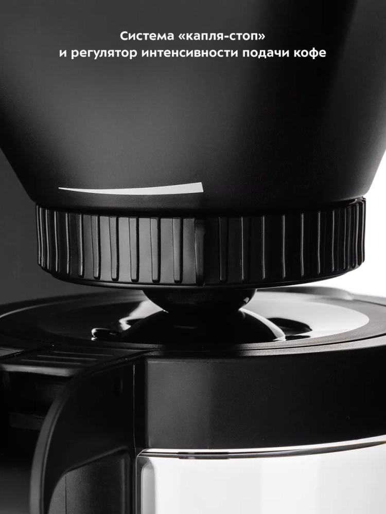 Воронка кофеварки оборудована противокапельной системой — затвором, приостанавливающим подачу кофе при вынимании кофейника из кофеварки. Вы можете налить кофе в чашку, не дожидаясь окончания приготовления. Также у воронки есть регулятор интенсивности подачи кофе в кофейник. Чем медленнее кофе поступает в кофейник, тем дольше он экстрагируется и тем крепче получается кофе.