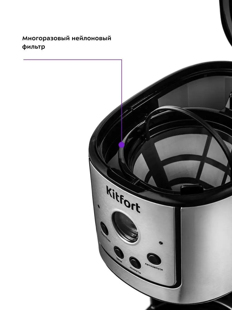 Отсек для хранения шнура на задней части корпуса позволяет аккуратно разместить кофеварку на кухне, не создавая беспорядка. Кофемашина совместима с различными фильтрами, что упрощает её обслуживание и уход. Корпус выполнен из прочного пластика, а стеклянная колба обеспечивает долговечность и надежность.