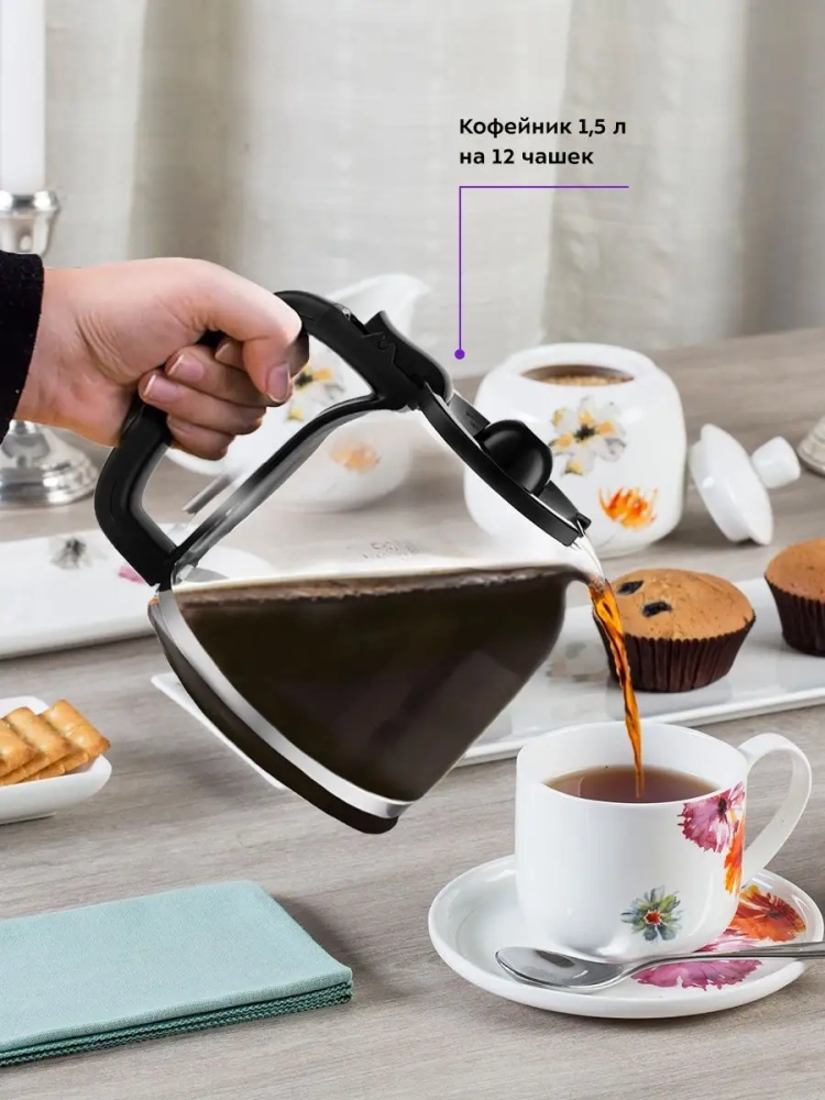 Электрическая капельная кофеварка мощностью 900 Вт и объемом 1,5 л — идеальное решение для приготовления кофе дома или в офисе. Эта техника позволяет быстро и удобно приготовить до 12 чашек ароматного кофе, что делает её незаменимой на вашей кухне. Кофемашина оснащена противокапельной системой, которая предотвращает проливание напитка при вынимании кофейника. Прозрачный корпус кофейника позволяет контролировать уровень оставшегося кофе. Идеальный подарок на любой случай: на Новый год, 23 февраля, 8 марта, день рождения, свадьбу или юбилей!