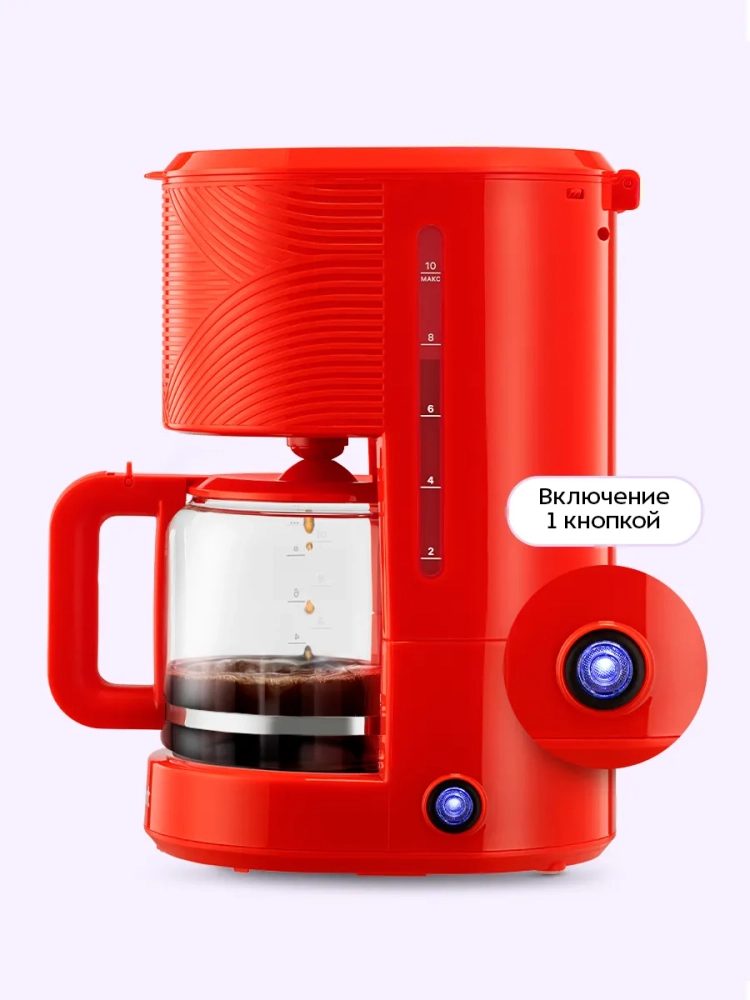 Управление кофеваркой осуществляется при помощи одной кнопки. Устройство предназначено для приготовления кофе в домашних условиях или в офисе.