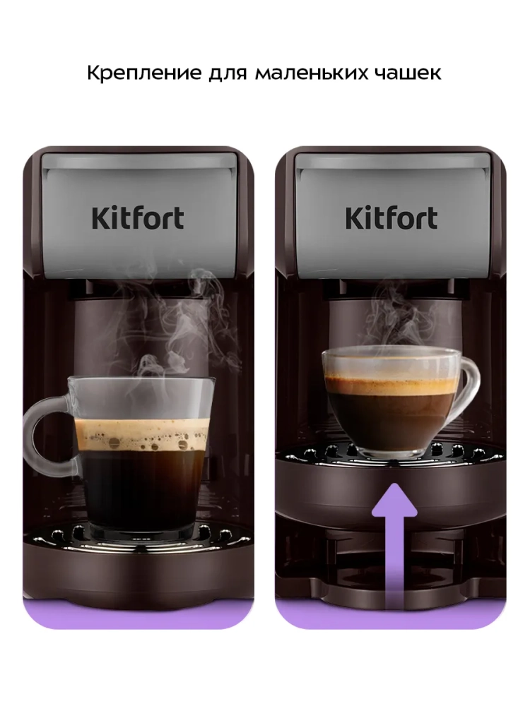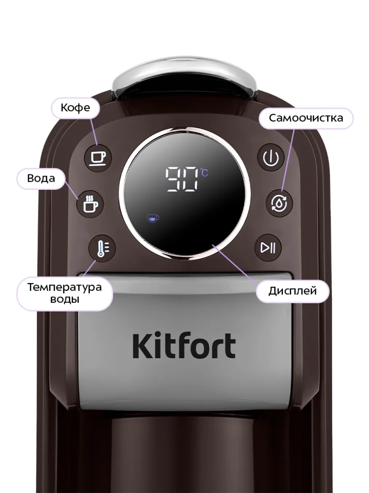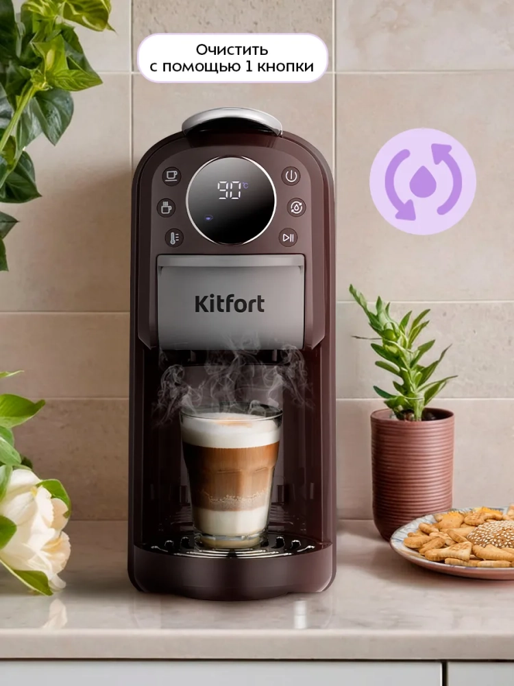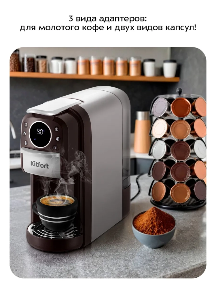 Кофеварка «3 в 1» Kitfort КТ-7656 — многофункциональное устройство, сочетающее в себе функции капсульной и рожковой кофеварки. Благодаря адаптерам кофеварка подходит для молотого кофе, капсул типа Nespresso Original и Dolce Gusto, а также может подавать горячую воду температурой 55, 75 или 100 °С.