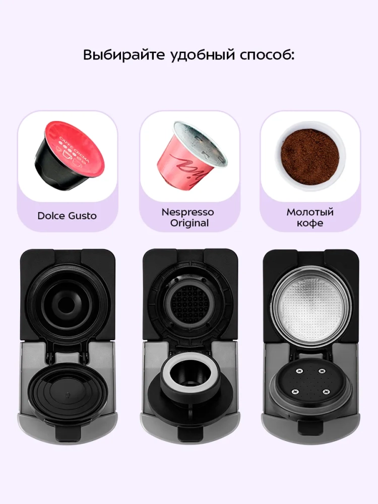 Кофеварка «3 в 1» KT-7656 совмещает в себе все преимущества рожковых и капсульных кофеварок.