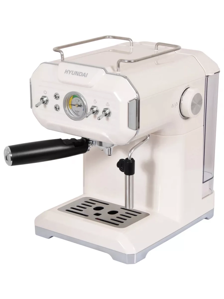 Кофеварка рожковая Hyundai HEM-5300 бежевый/серебристый, мощность 850Вт, используется молотый кофе, давление помпы 20Бар