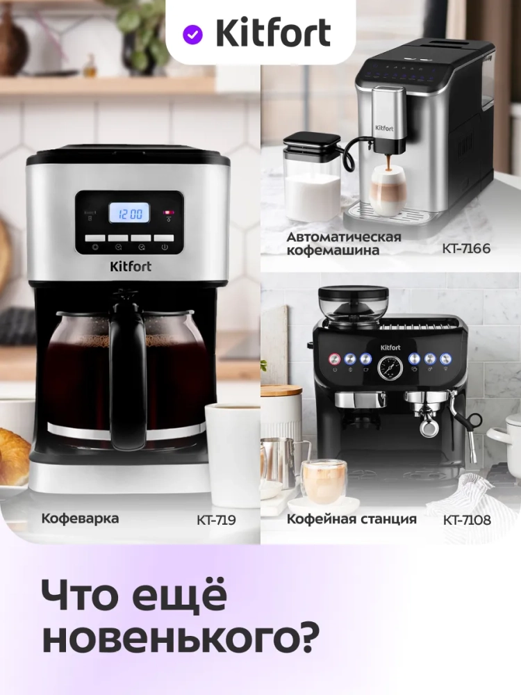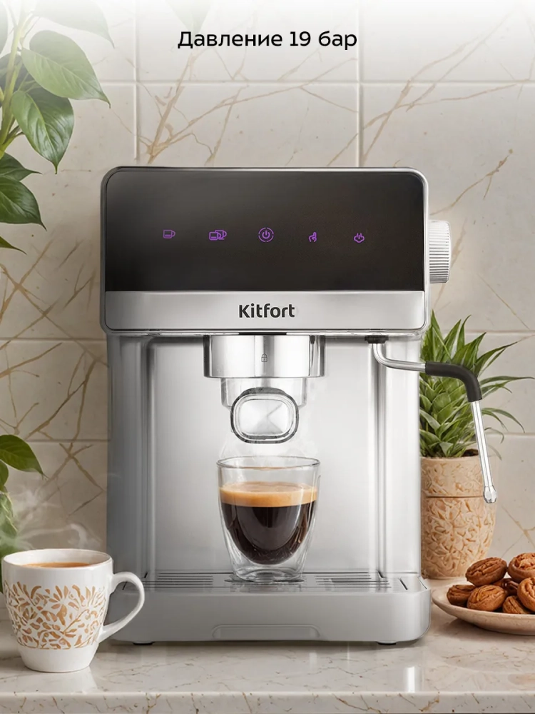 Кофеварка Kitfort КТ-7418 поможет приготовить кофе эспрессо, капучино или латте, а также множество других видов кофе на ваш вкус. С помощью стимера вы можете приготовить молочную пенку, а также подогреть паром остывший чай или молоко.