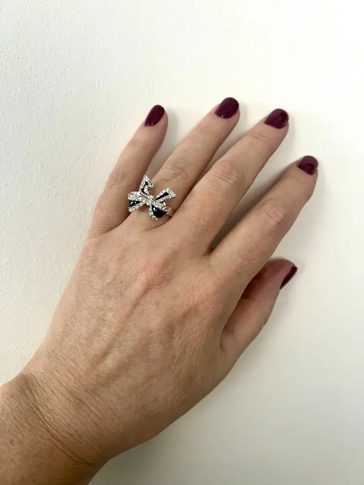 Привнесите нотку нежности и кокетства в свой повседневный образ! Это очаровательное кольцо в форме пышного банта — идеальное воплощение женственности. Ювелирно проработанные детали из белого металла дополнены контрастной черной эмалью и усыпаны россыпью сверкающих кристаллов. Аксессуар станет изысканным акцентом как для романтического свидания, так и для праздничного выхода, подчеркивая хрупкость и грацию ваших рук