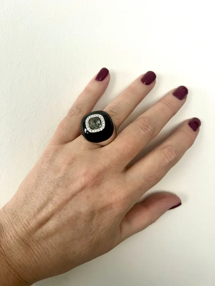Добавьте дерзкий и роскошный акцент в свой образ! Это эффектное кольцо — воплощение современной элегантности. Массивный корпус с глубоким глянцевым покрытием черной эмалью (или ювелирной смолой) контрастирует с холодным блеском металла. Центральный элемент в форме крупного кристалла огранки «кушон», обрамленный ореолом из мелких сияющих страз, притягивает взгляды и создает магическую игру света. Идеально подходит для вечерних выходов, коктейльных вечеринок или как смелое дополнение к строгому деловому костюму