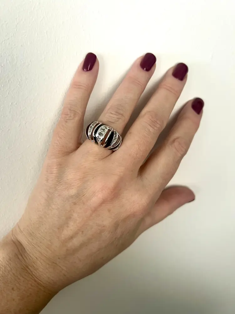 Добавьте дерзкий и роскошный акцент в свой образ! Это эффектное кольцо — воплощение современной элегантности и графичного дизайна. Массивный корпус украшен чередующимися полосами глубокой черной эмали и холодного блеска металла, создавая узнаваемый и стильный контраст. Центральная дорожка из сверкающих фианитов (или кристаллов) притягивает взгляды, добавляя украшению благородного сияния. Идеально подходит для тех, кто ценит стиль «тихая роскошь» с характером