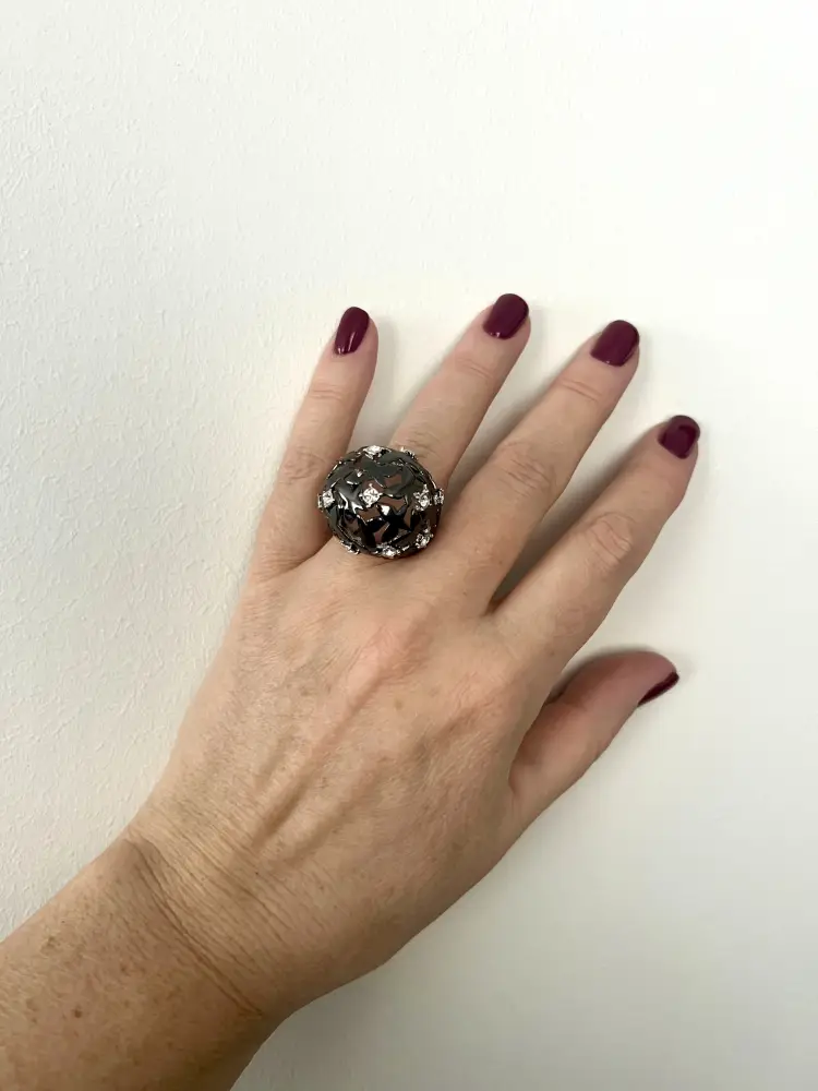 Почувствуйте легкость и свободу в каждом движении! Это необычное кольцо — настоящий арт-объект на ваших руках. Объемная сфера, сплетенная из множества изящных бабочек, символизирует трансформацию и внутреннюю красоту. Сочетание глубокого черненого металла и искрящихся кристаллов создает эффект ночного сада, наполненного магией. Это украшение для тех, кто не боится быть в центре внимания и ценит аксессуары со смыслом
