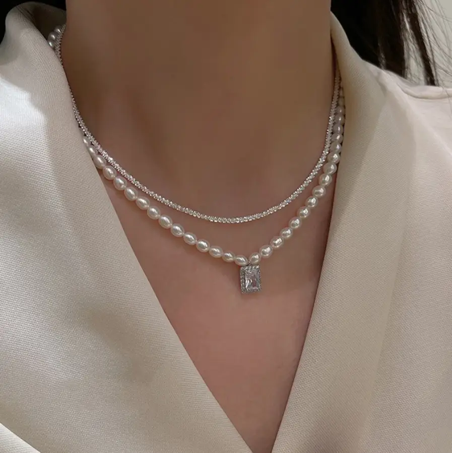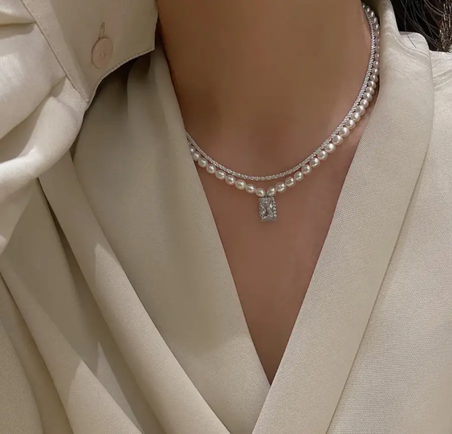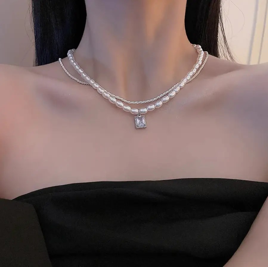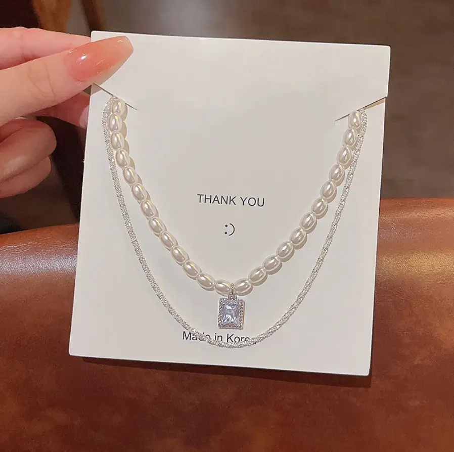 Колье на шею с жемчугом и цепочкой с Кристаллом серебристое