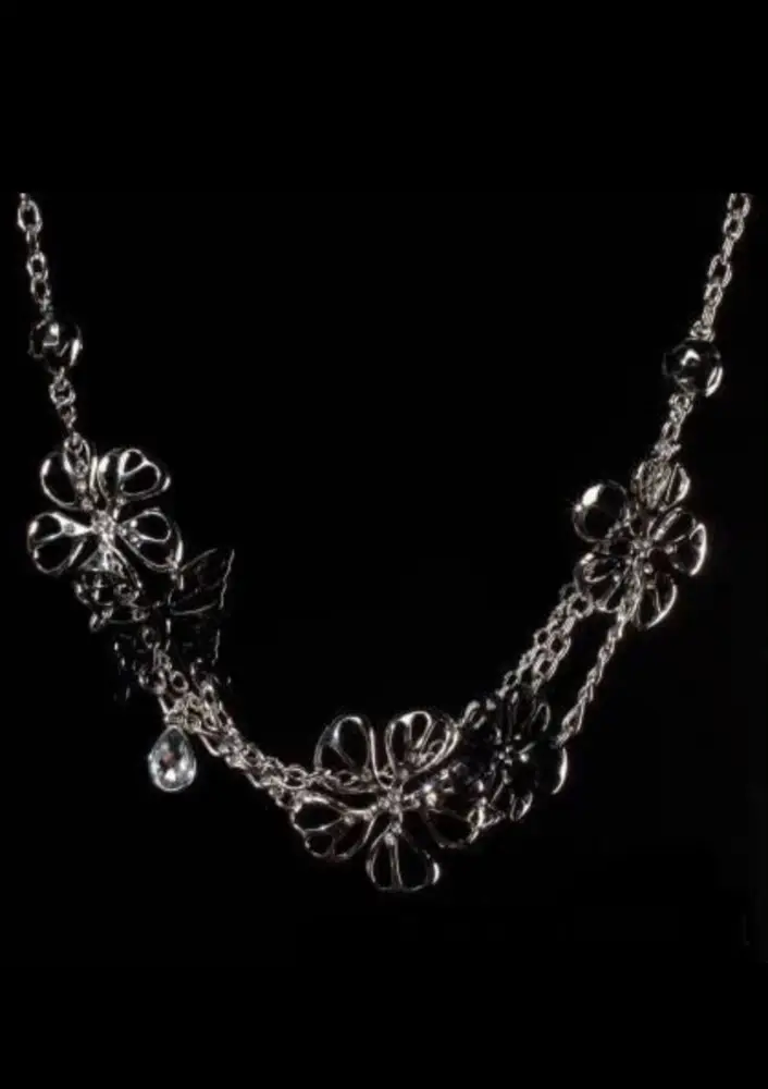 Это изысканное колье — воплощение нежности и утонченности. Ювелирно проработанные ажурные цветы в серебристом исполнении создают легкий, воздушный образ. Центральный акцент в виде прозрачной хрустальной капли придает украшению благородный блеск, красиво играя в лучах света. Идеальный выбор для коктейльного платья, свадебного торжества или романтического свидания. Подчеркните свою женственность деталями, которые хочется рассматривать - Колье с подвесками (шармами).