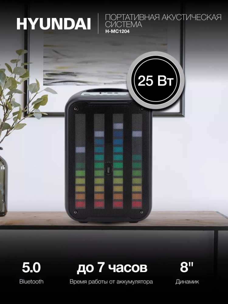 Беспроводная блютус колонка Hyundai H-MC1204 добавит музыки и ярких красок любому мероприятию на открытом воздухе или в здании. Портативная акустическая система поможет организовать на пикнике достаточно громкую музыку или наполнить ей небольшое помещение. Передняя панель блютуз колонки выполнена в виде яркой подсветки с цветомузыкой в виде эквалайзера, двигающейся в такт мелодии на манер светомузыки.
