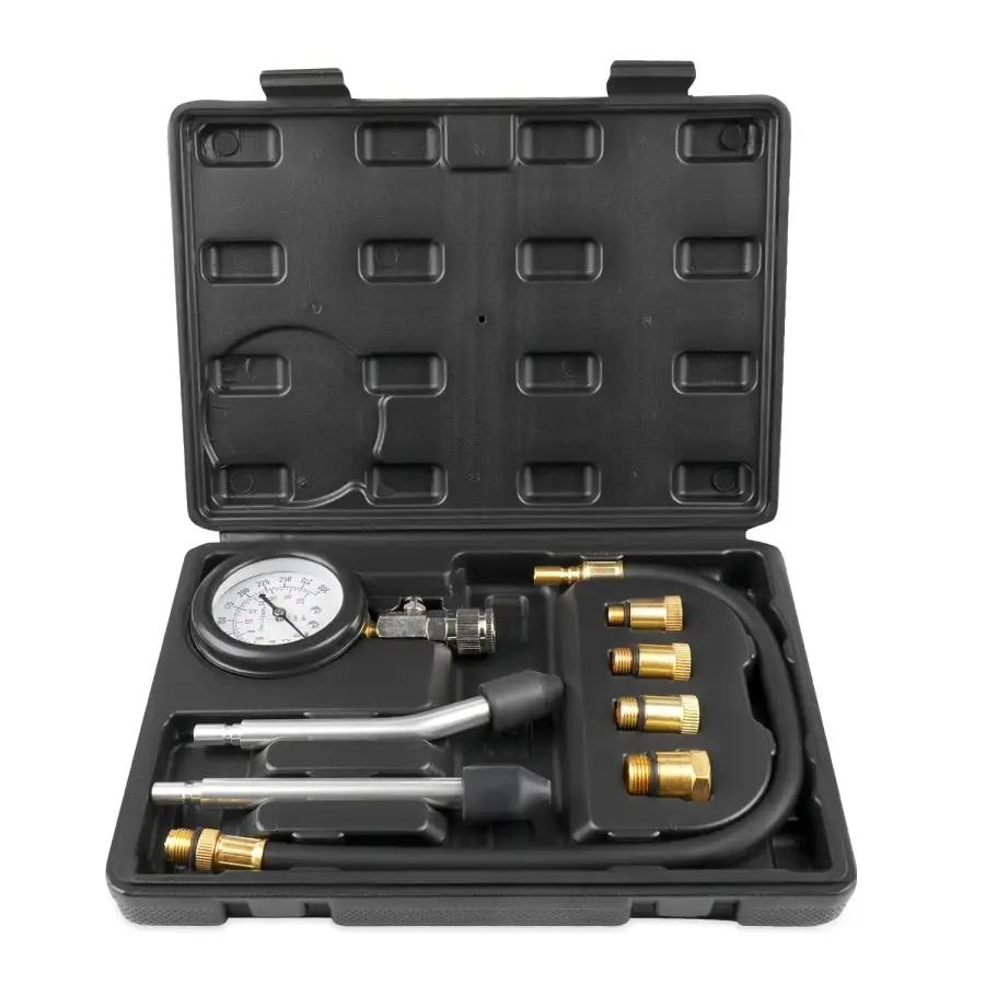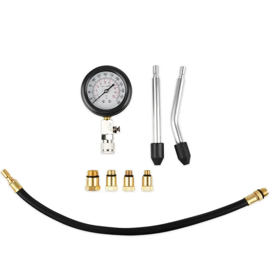 Компрессометр подключается к свечному отверстию цилиндра. При прокрутке двигателя стартером (с отключенным зажиганием) прибор фиксирует максимальное давление в цилиндре. Гибкий шланг позволяет проводить измерения без демонтажа оборудования, препятствующего измерениям.