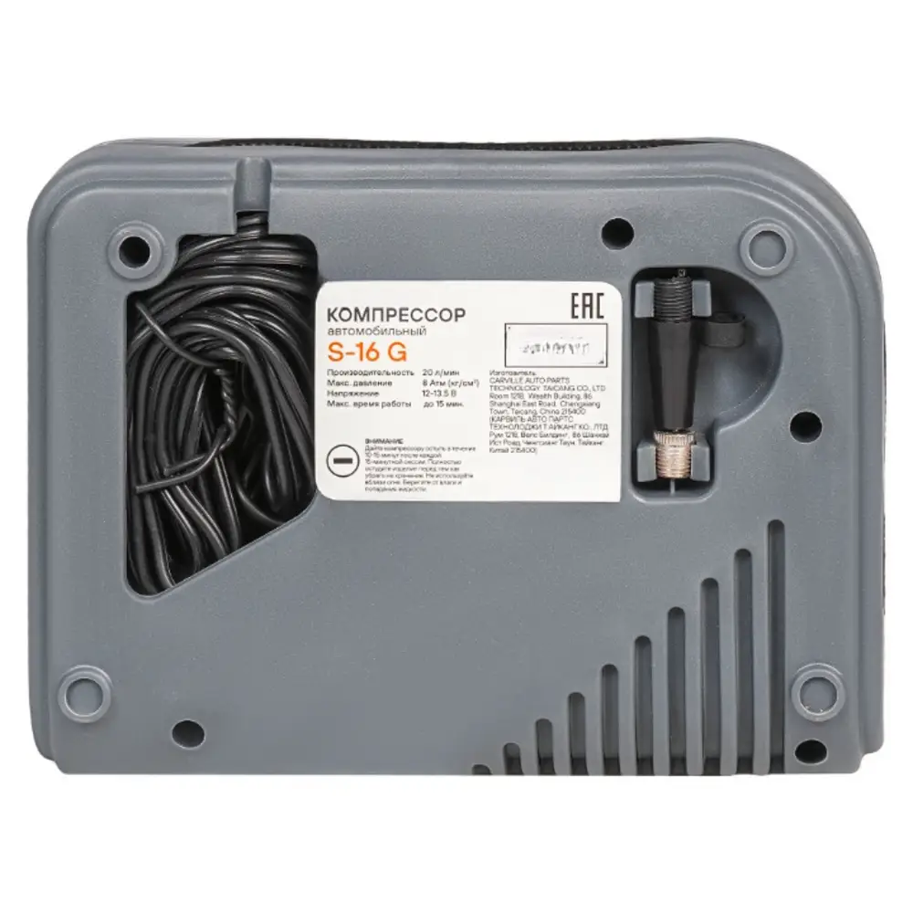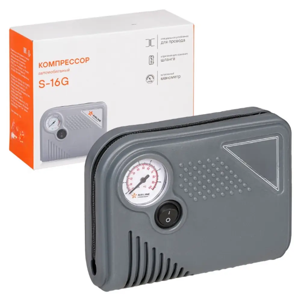 Автомобильный компрессор предназначен для получения сжатого воздуха в дорожных условиях. Компрессор модели S-16 G обладает компактными размерами и производительностью до 20 л/мин с максимальным давлением 8 Атм (кг/см2). В данном компрессоре используется конструкция с плавающим шатуном, что увеличивает ресурс работы в 2-3 раза, по сравнению с более мощными "металлическими компрессорами". Время накачивания полностью спущенного колеса R14 до 2 Атм не превысит 6 минут. Провод и шланг компрессора удобно прячутся в корпус изделия.