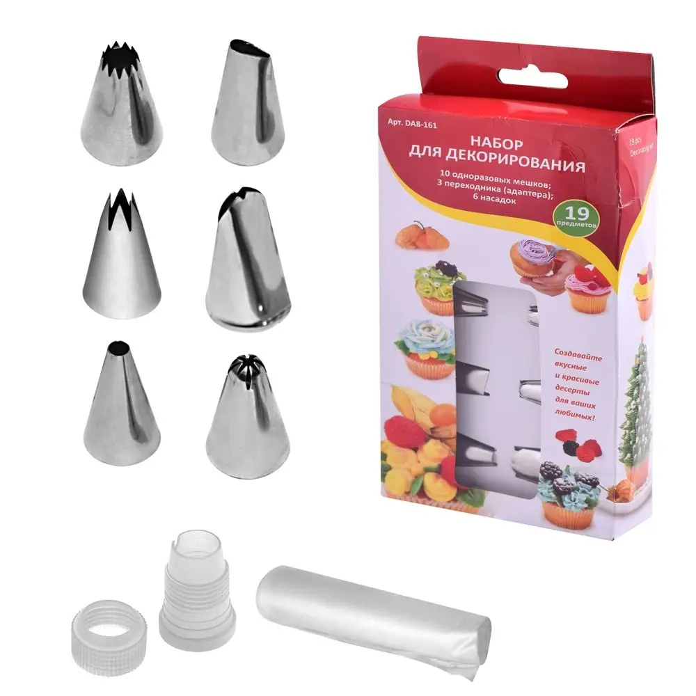 Набор предназначен для декорирования кондитерских изделий и выпечки. С помощью этого набора Вы сможете создавать из крема и глазури цветы, вензеля, узоры и фигурки не хуже профессиональных кондитеров. Украшайте с помощью набора для декорирования пирожные, печенье и торты разноцветными кремами или закуски густыми соусами. Фантазируйте и проявляйте свое творчество, привлекайте к украшению детей – совместное украшение может стать Вашей семейной традицией. Набор также станет отличным подарком Вашим родным и близким.