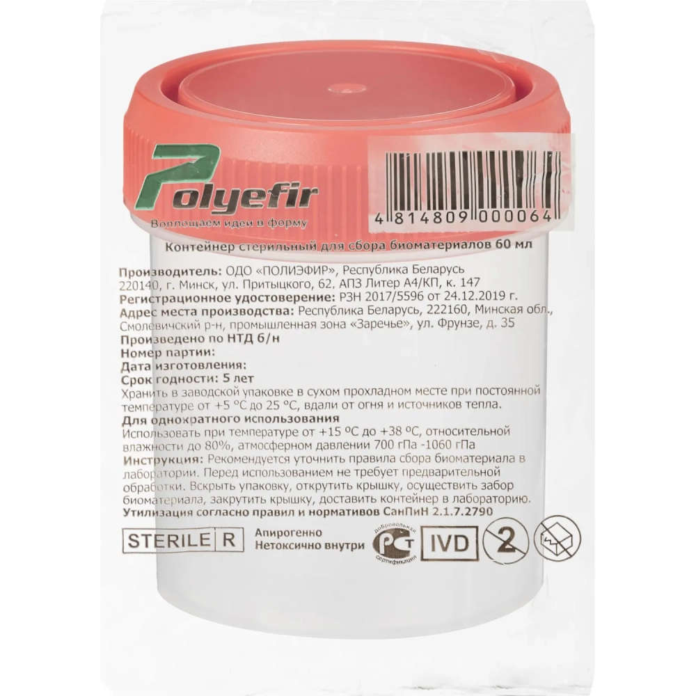 Контейнер д/сбора биоматер 60 мл, Полиэфир инд.уп, стерильный 250 шт/уп