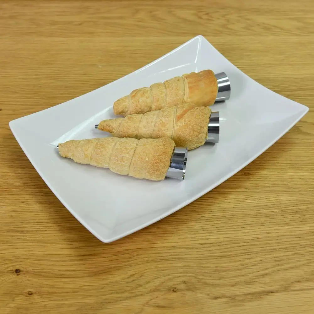 Пользоваться приспособлениями очень просто: слоеное тесто разрезается на тонкие полоски, после чего им обматываются конусы внахлест. Вместе с конусами тесто отправляется в духовку и выпекается до готовности.