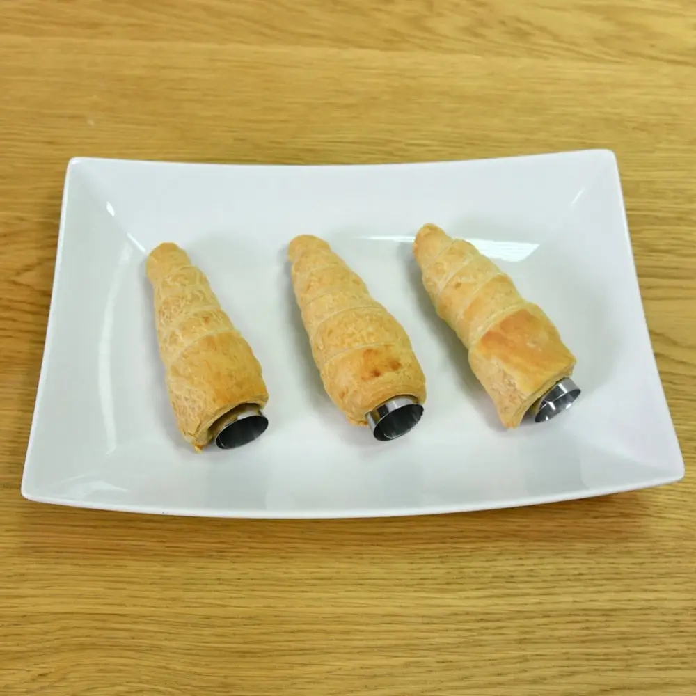 Разрежьте слоеное тесто на полоски, обмотайте конусы внахлест и поместите в разогретую духовку. Выпекайте до готовности, остудите и затем наполните своим любимым кремом или несладкой начинкой. Начинка может быть на любой вкус – из овощей или с мясом. Изготовлено из коррозионностойкой (нержавеющей) стали. Размер: длина 9 см, диаметр 2,5 см.