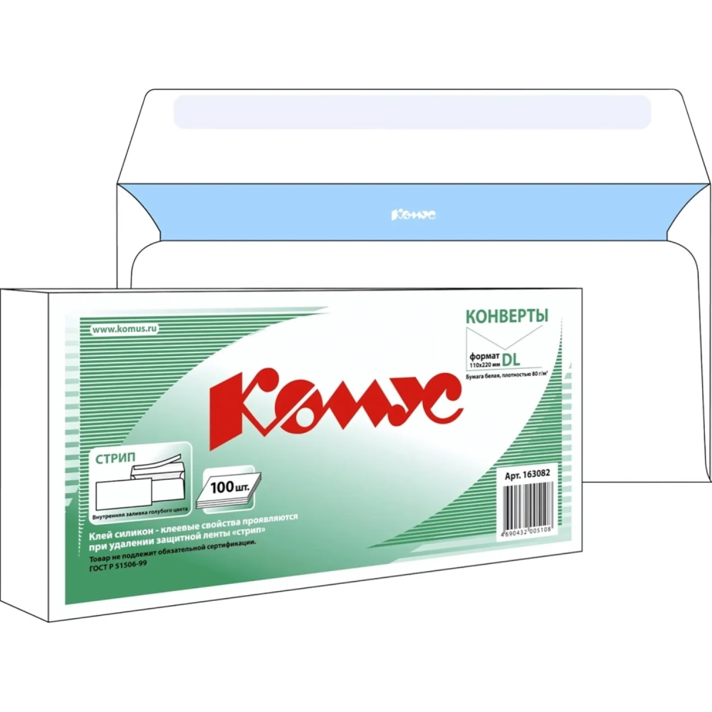 Конверт белый E65 стрип 110х220 80г КОМУС 100шт/уп 12уп/кор