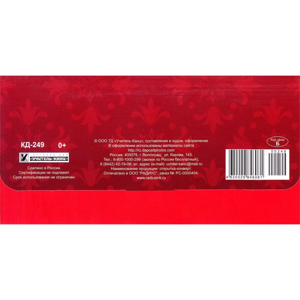 Конверт открытка Красная с золотым бантом, 10 шт/уп, КД-249
