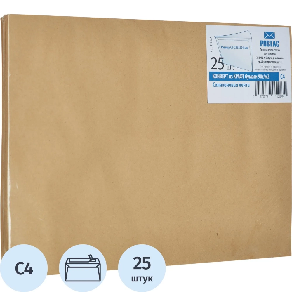 Конверт С4 из крафт бум. 90 г/м2 с силиконовой лентой, 25 шт/уп