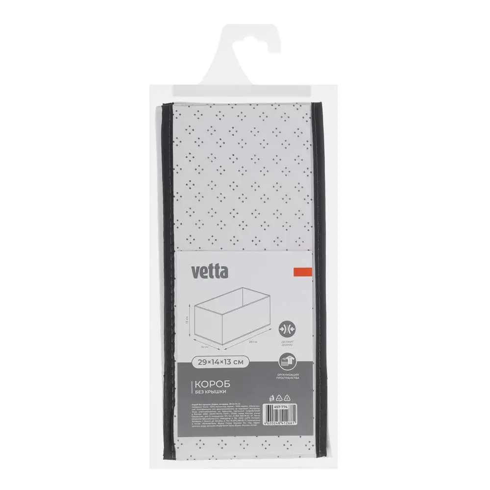 Короб VETTA «Дафна» — это универсальный и практичный аксессуар для хранения различных предметов. Он выполнен из качественного и прочного материала оксфорд, который обеспечивает надёжность и долговечность изделия. Имеет прямоугольную форму и размеры 29x14x13 см, что позволяет использовать его для хранения одежды, обуви, аксессуаров, документов и многого другого. Благодаря своей вместительности и удобной конструкции, он станет незаменимым помощником в вашем доме или офисе. Стильный и современный дизайн короба VETTA «Дафна» с чёрно-белым рисунком в горошек добавит изысканности и шарма любому интерьеру. Он прекрасно впишется в любой стиль оформления комнаты и будет гармонично сочетаться с другими элементами декора. Короб VETTA «Дафна» прост в уходе и обслуживании. При необходимости его можно легко очистить от загрязнений с помощью влажной тряпки или губки.